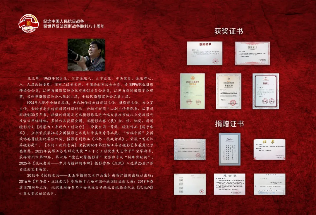 以王玉华为代表的摄影团队,从2013年底开始关注他们身边的抗战老兵。在阅读了相当数量的史料,做了大量细致深入的调查研究基础上,他们用摄影为家乡土地上的每一位健在的抗战老兵做了一份珍贵的视觉文献档案。《丰碑》是王玉华继2015年出版的《抗战老兵——王玉华摄影艺术作品集》之后,持续深耕十年,精心打磨的又一部为抗战存史,为抗战老兵立传的摄影作品集。和第一部摄影作品集单独将老兵们的特写集中展示所不同的是,王玉华团队的二度创作采纳了以文献摄影的方法予以再现这段历史,再现那些可爱可敬的抗战老兵的辉煌事迹。老兵们的生活状态,他们与家人,与社会的联系,他们在战后数十年里的经历和遭遇,他们的所思所感,成为王玉华二度创作的重要一翼。抗战老兵从高度凝练的肖像,到细节化,生动性更为丰富、更为强烈的形象展示,其真实感和亲近感也随之加深。至此,抗战老兵影像的呈现获得了集体型人格与个体型人格的重合,老兵形象借此实现了立体再造。