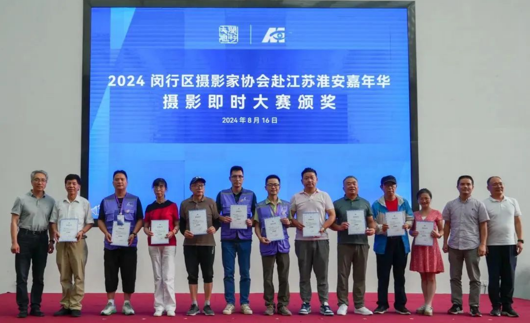 上海市文学艺术界联合会社会服务处副处长章燕、上海市摄影家协会副主席毛安吉、闵行区融媒体中心党组书记、主任茅杰、浙江省金华市文学艺术界联合会党组成员徐劲松、江苏省淮安市文学艺术界联合会王维国主席、安徽省黄山市文学艺术界联合会蒋凌将主席为《2024年闵行区摄影家协会嘉年华淮安即时摄影大赛》的获奖会员颁发证书。