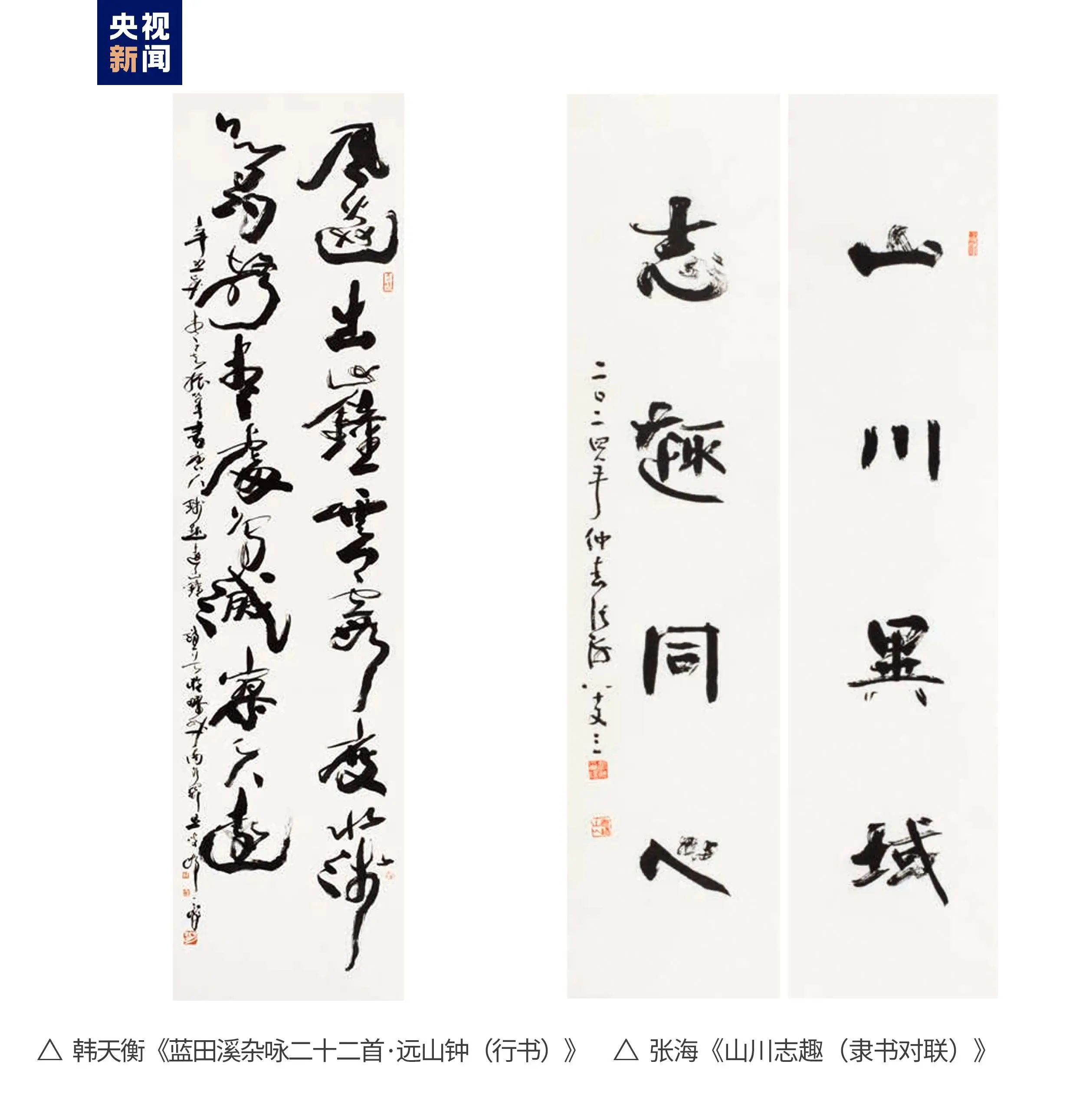 中国艺术研究院中国篆刻艺术院名誉院长、西泠印社名誉社长韩天衡的书法作品《蓝田溪杂咏二十二首·远山钟(行书)》,中国书法家协会名誉主席张海的《山川志趣(隶书对联)》《峰高无坦途(行草书条幅)》,中国文联副主席、西泠印社副社长兼秘书长陈振濂的《苏东坡念奴娇·中秋(行书中堂)》《秉烛夜游(隶书条幅)》等,在展现中国传统文化精粹的同时,彰显书法在当代艺术表达中的创新与活力。