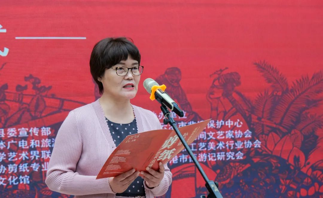 (图为省民协剪纸专业委员会主任、国家级非遗剪纸项目代表性传承人杨兆群致辞)