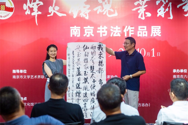 为纪念中国人民抗日战争暨世界反法西斯战争胜利80周年,传承和弘扬伟大抗战精神,9月2日,由南京市书法家协会、六合区委统战部、六合区文化和旅游局、六合区经济开发区、六合区文学艺术界联合会、六合区档案馆等单位共同主办的“烽火铸魂・茉莉芬芳”南京书法作品展在六合区文化馆开幕。南京市文联党组成员、副主席李志平,南京市文联副主席、市书法家协会主席谢少承出席活动。展览共邀请全市80幅书法作品参展。