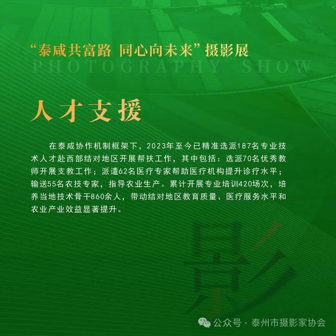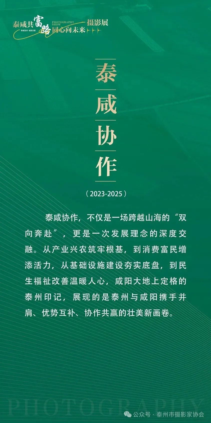 “泰咸共富路 同心向未来”摄影展共分“泰咸协作”“咸阳光影”两个板块,分别从咸阳历史积淀、风土人情、自然风光、红色文化、经济发展以及两地交流交往等全方位立体化展现泰咸情深,共富前行的时代图景。