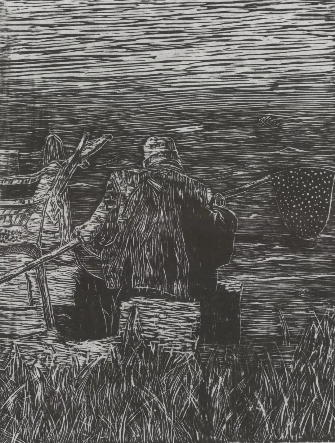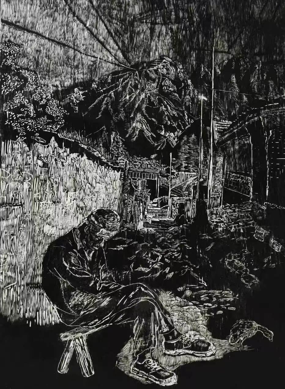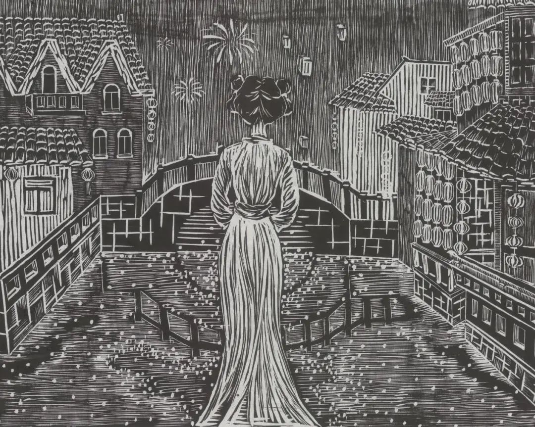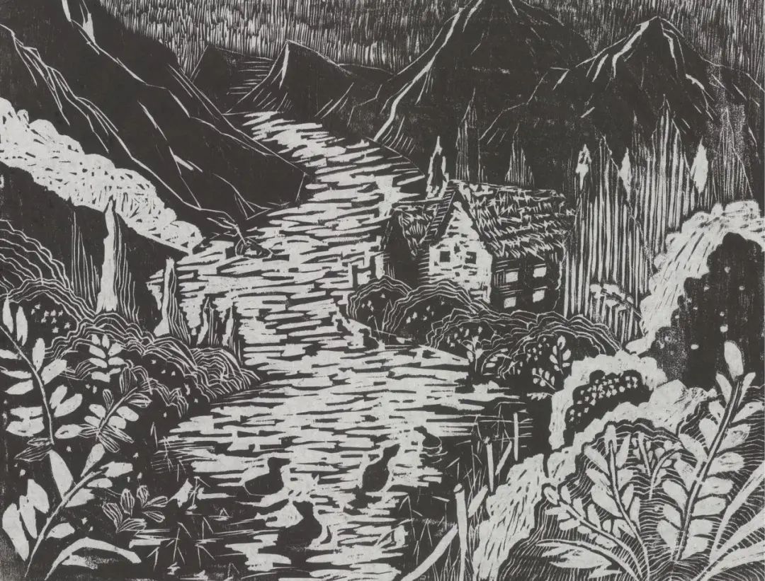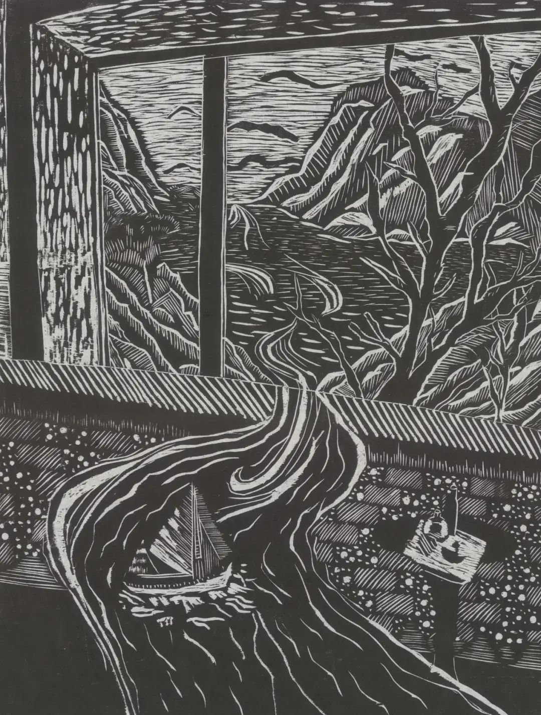 《孤舟渡水,千山作陪》黑白木刻 李嘉欣 2024