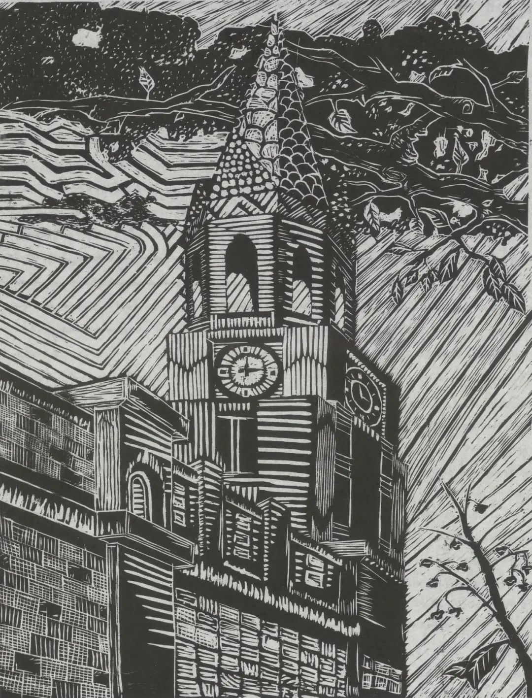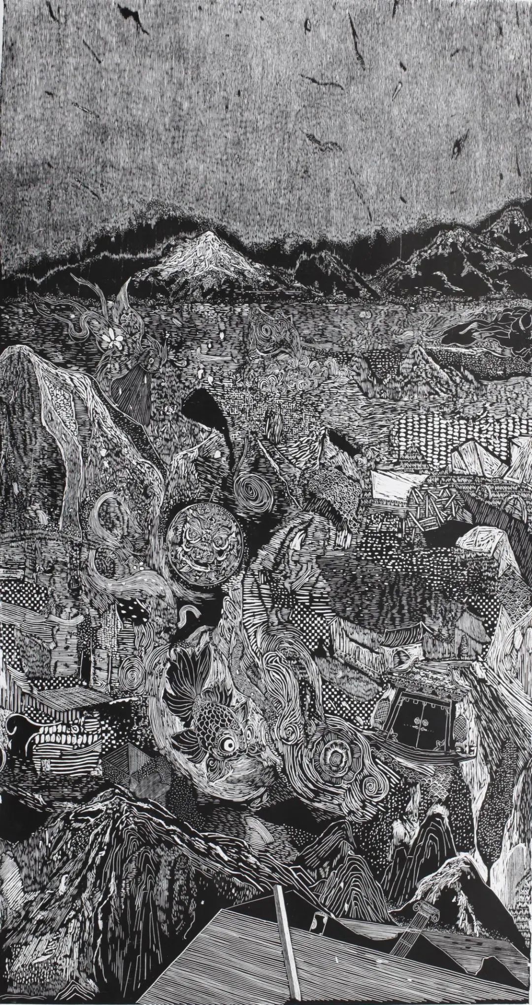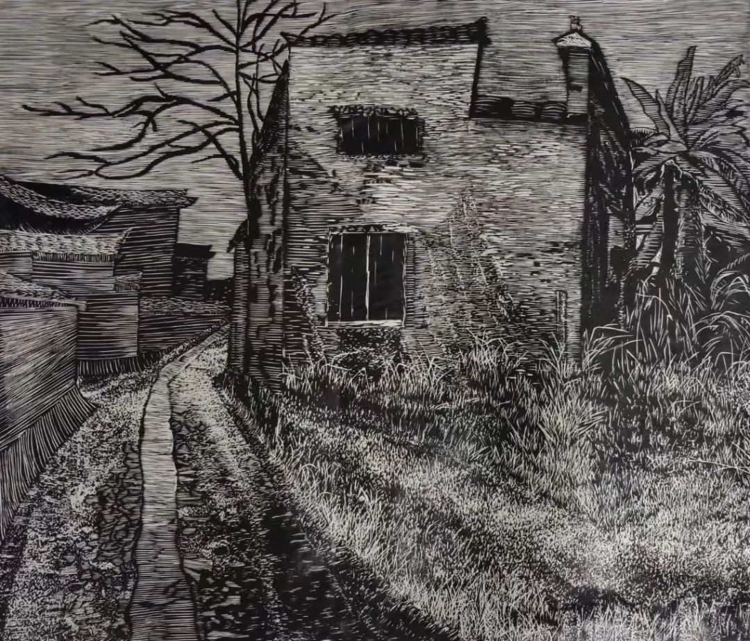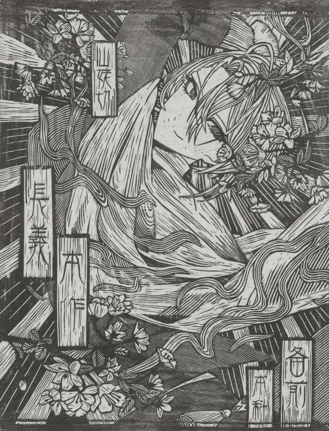 《孤舟渡水,千山作陪》黑白木刻 李嘉欣 2024