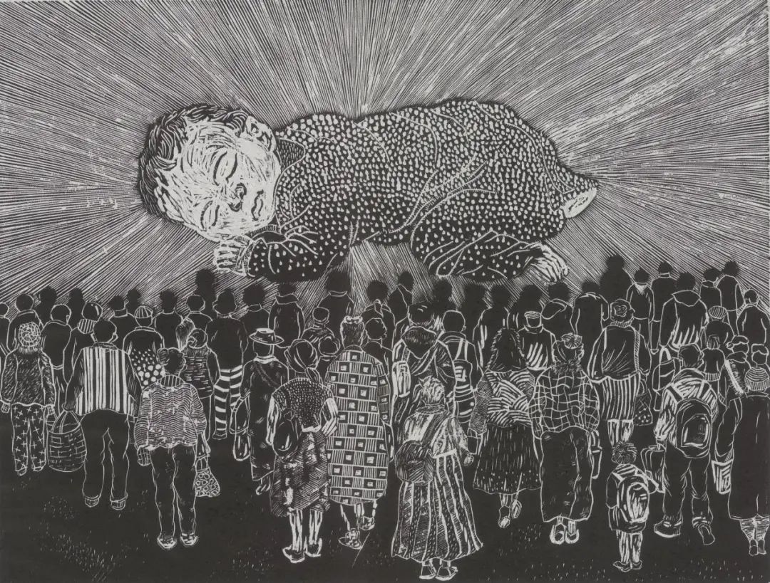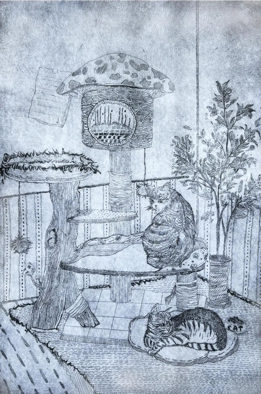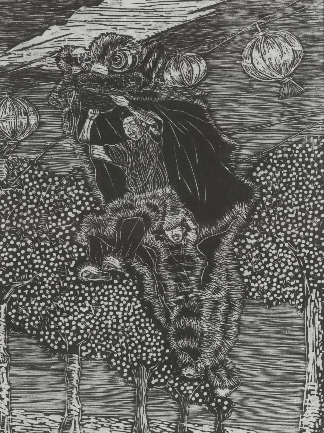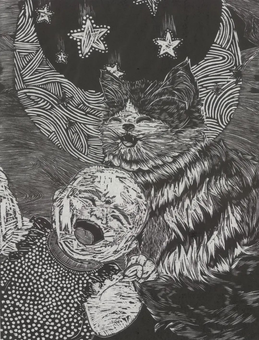 《猫咪新年幻想》黑白木刻 洪惠心 2024