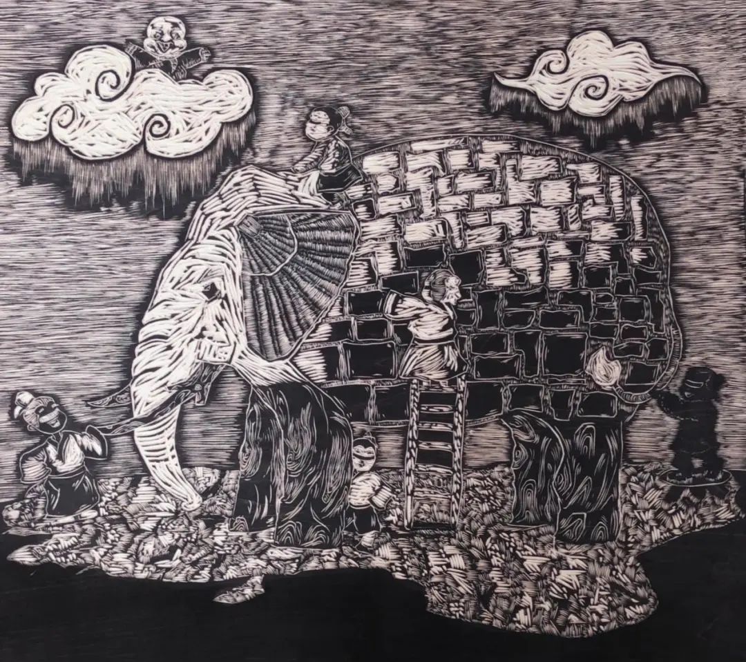《盲人摸象》黑白木刻 廖梦蓥 2019