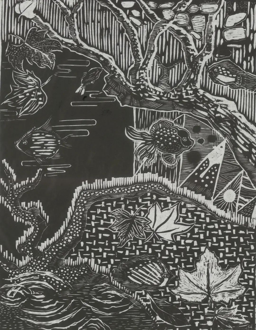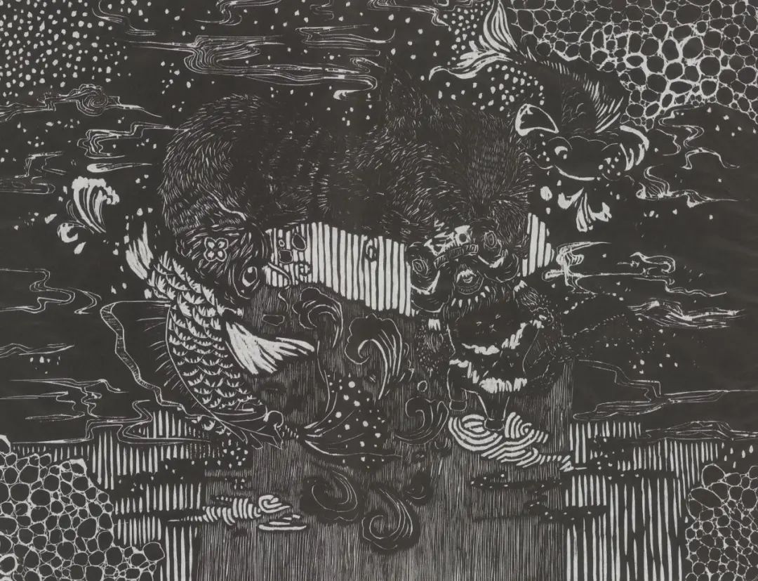 《鱼的奇思妙想》 黑白木刻 朱美彤 2024
