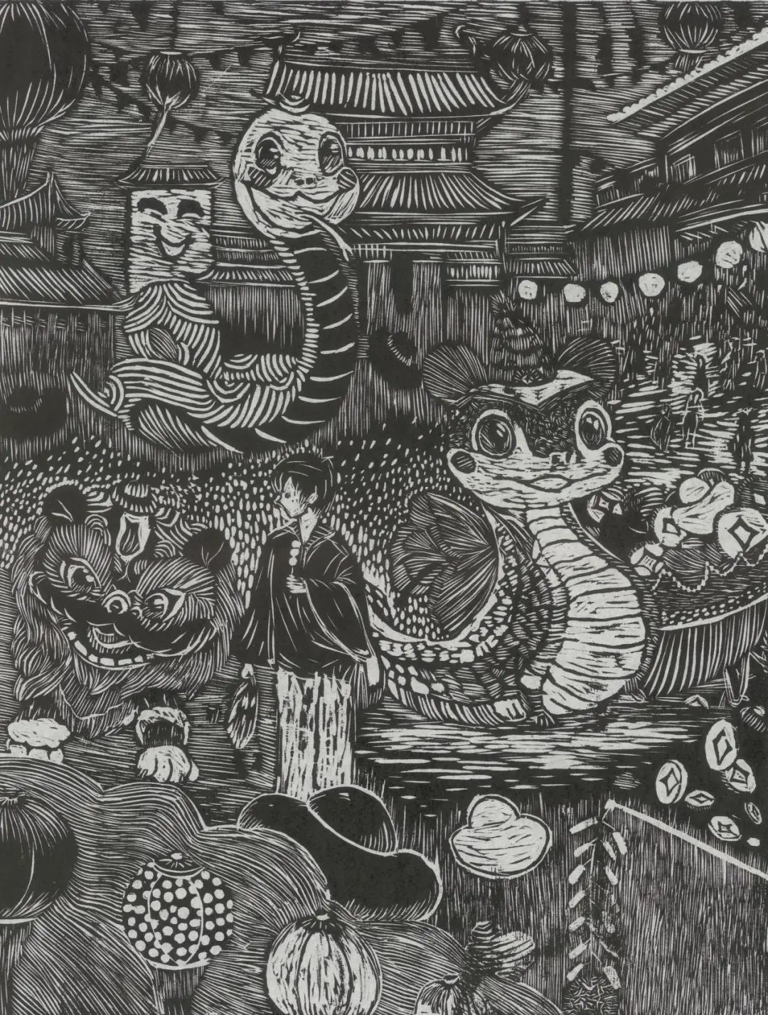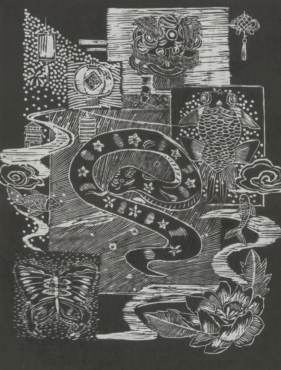 《画蛇添福》黑白木刻 邹倩熔 2024
