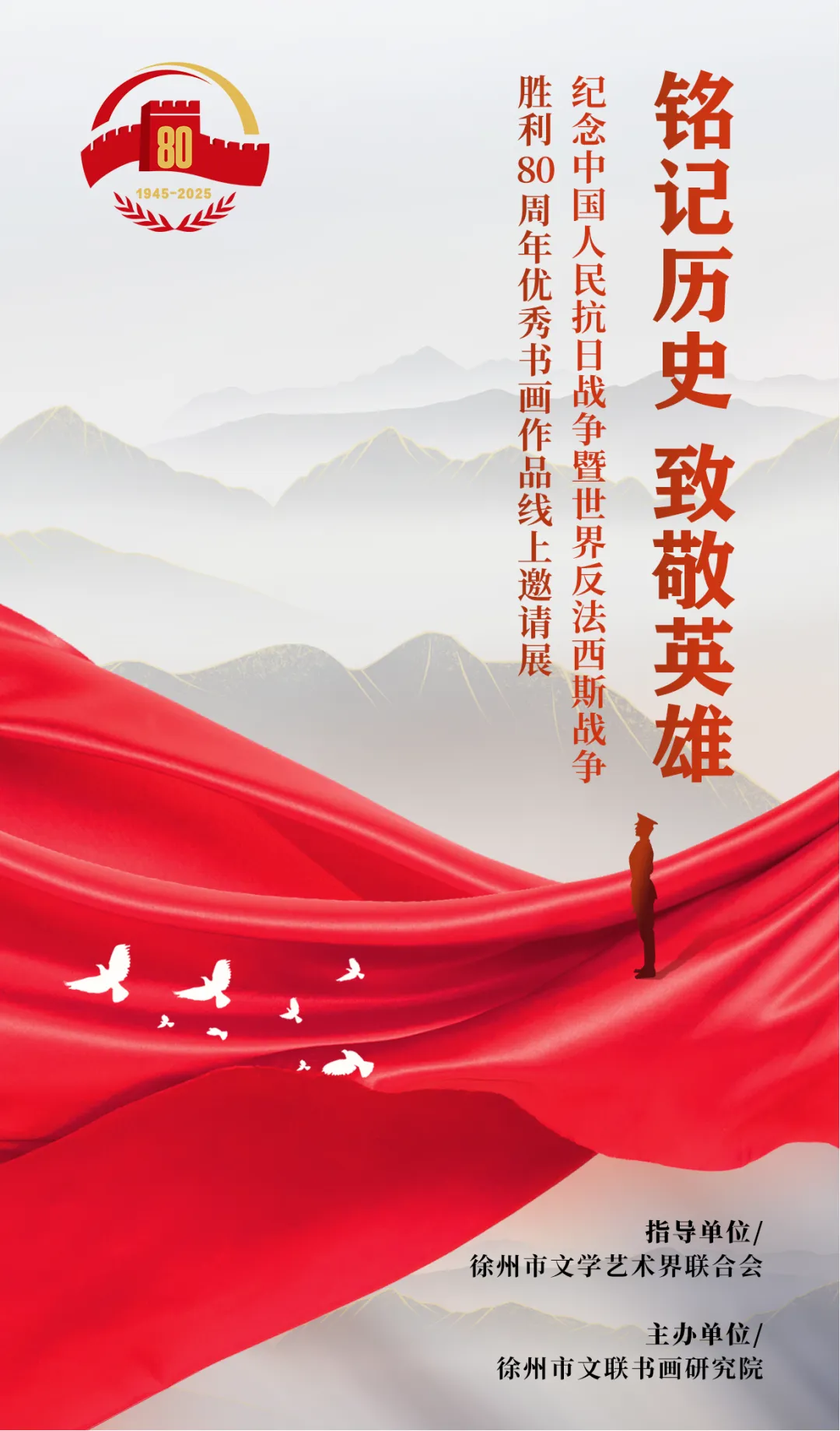 在徐州市文学艺术界联合会的悉心指导下,徐州市文联书画研究院精心策划了本次“铭记历史 致敬英雄”——纪念中国人民抗日战争暨世界反法西斯战争胜利80周年优秀书画作品线上邀请展。我们以艺术之名,回望那段烽火连天的峥嵘岁月;我们借笔墨之韵,致敬那些为民族独立、人民解放和世界和平英勇献身的先烈与英雄。