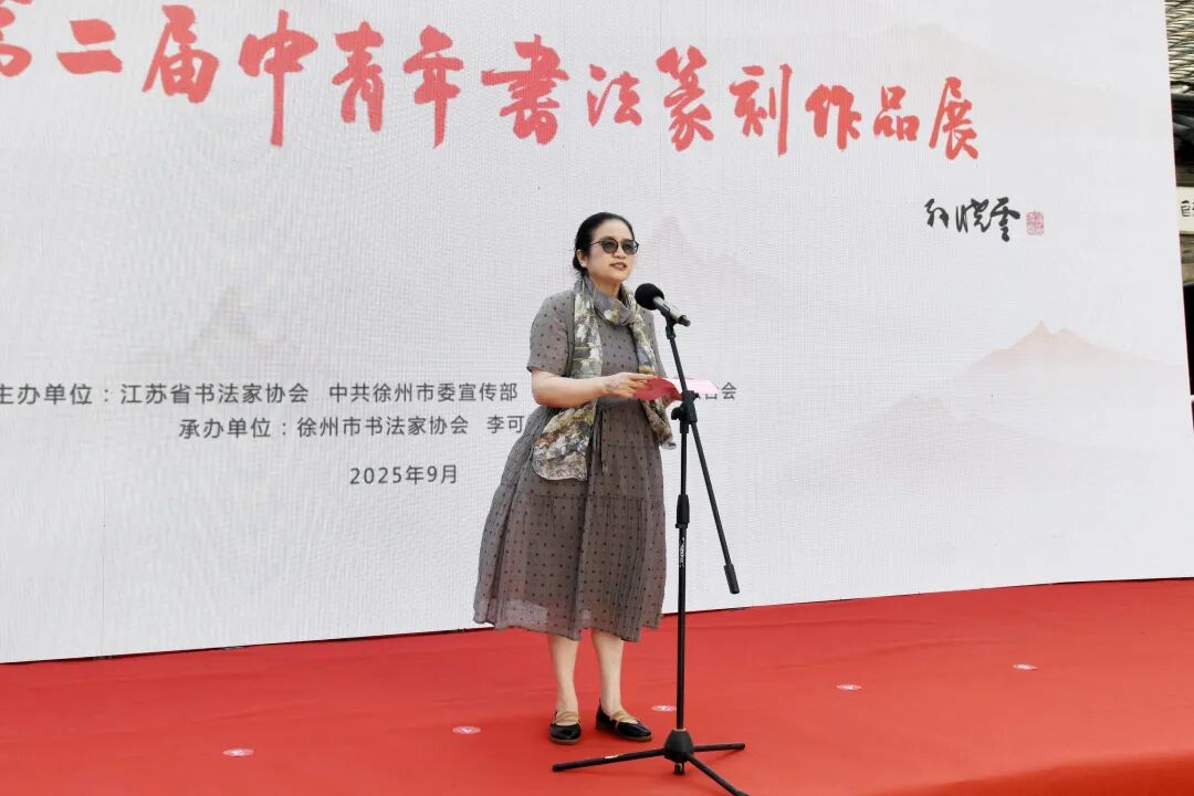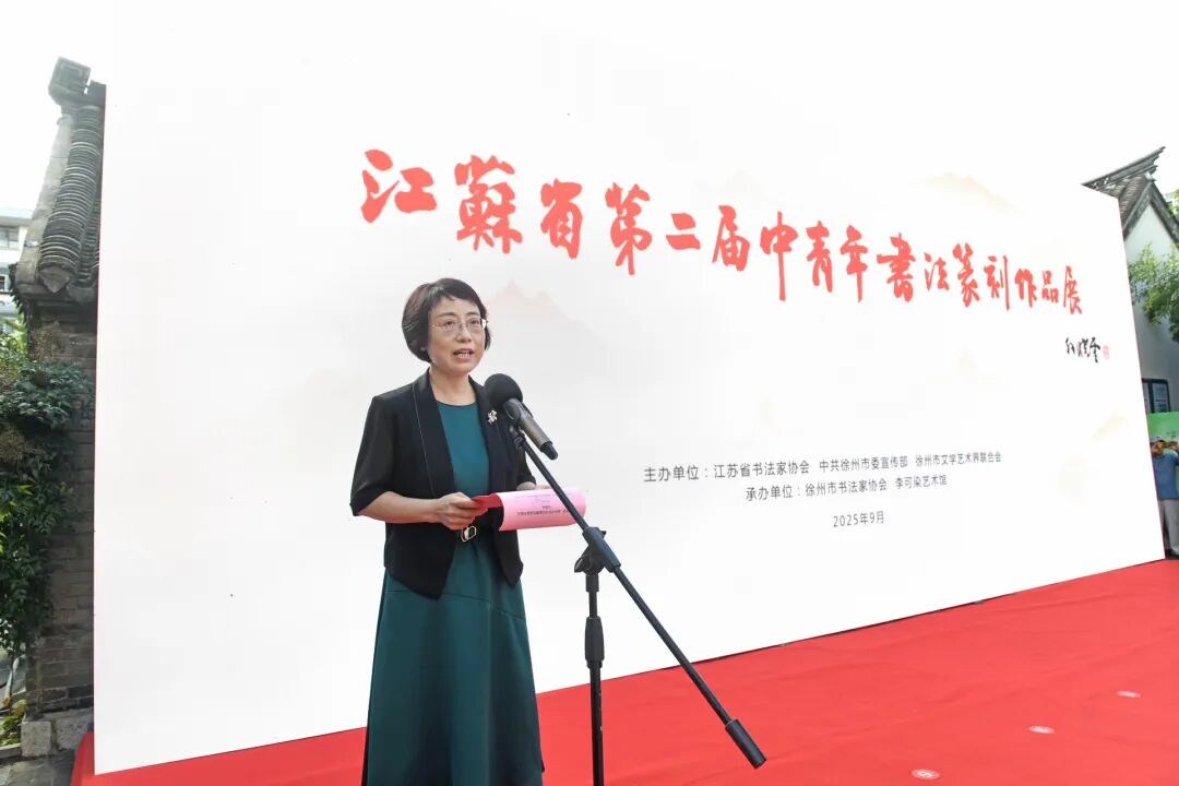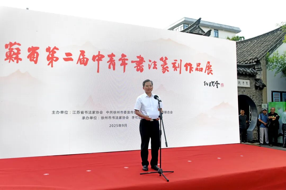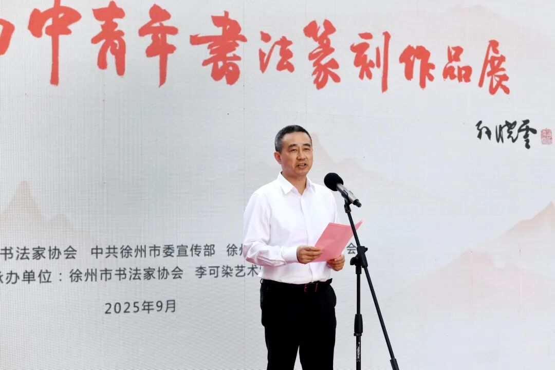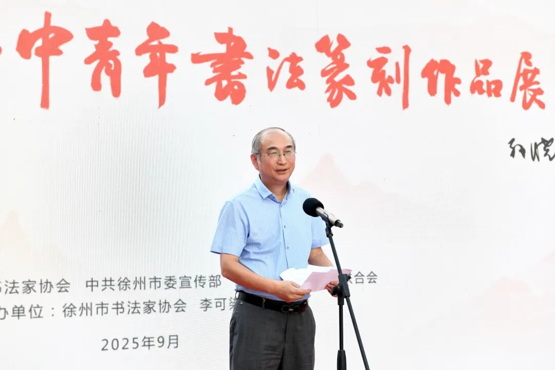 孙晓云说,江苏是文化大省,书法大省,在习近平文化思想指引下,书法事业蓬勃发展,人才梯队建设成效显著,老中青书法家薪火相传,书法教育体系日趋完善,群众性书法活动蓬勃开展,创作成果斐然,在国家级展览中屡创佳绩,一直走在全国书法的前列。徐州在市委市政府“文化强市”战略引领下,先后成功举办江苏省首届中青年书法篆刻展、省第二届篆隶书法作品展等高规格展览,充分彰显了书法大市的文化担当,生动诠释了“中国书法名城”的深厚底蕴与时代活力。本届全省中青年书法篆刻展览呈现出三个鲜明特点:一是创作队伍多元发展,专业书家与新文艺群体、高校师生共同参与;二是艺术水准显著提升,深耕传统又锐意创新,涌现出一批兼具思想深度与艺术高度的精品;三是彰显时代精神,整体呈现正大庄严的艺术气象。充分体现了当代书法工作者“守正创新”的艺术追求,也是“赓续文脉、开拓新境”的又一次实践。