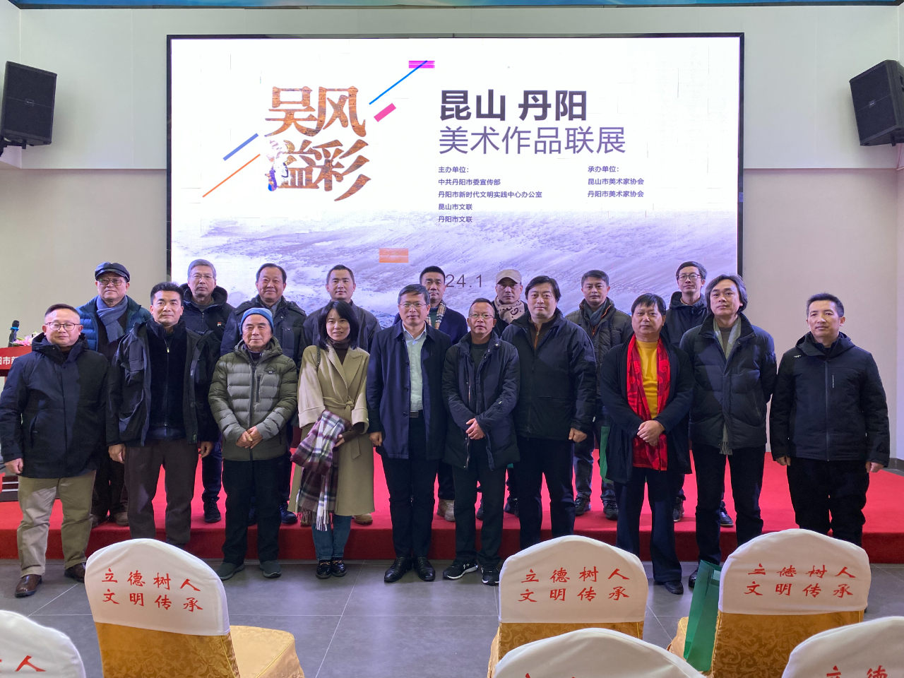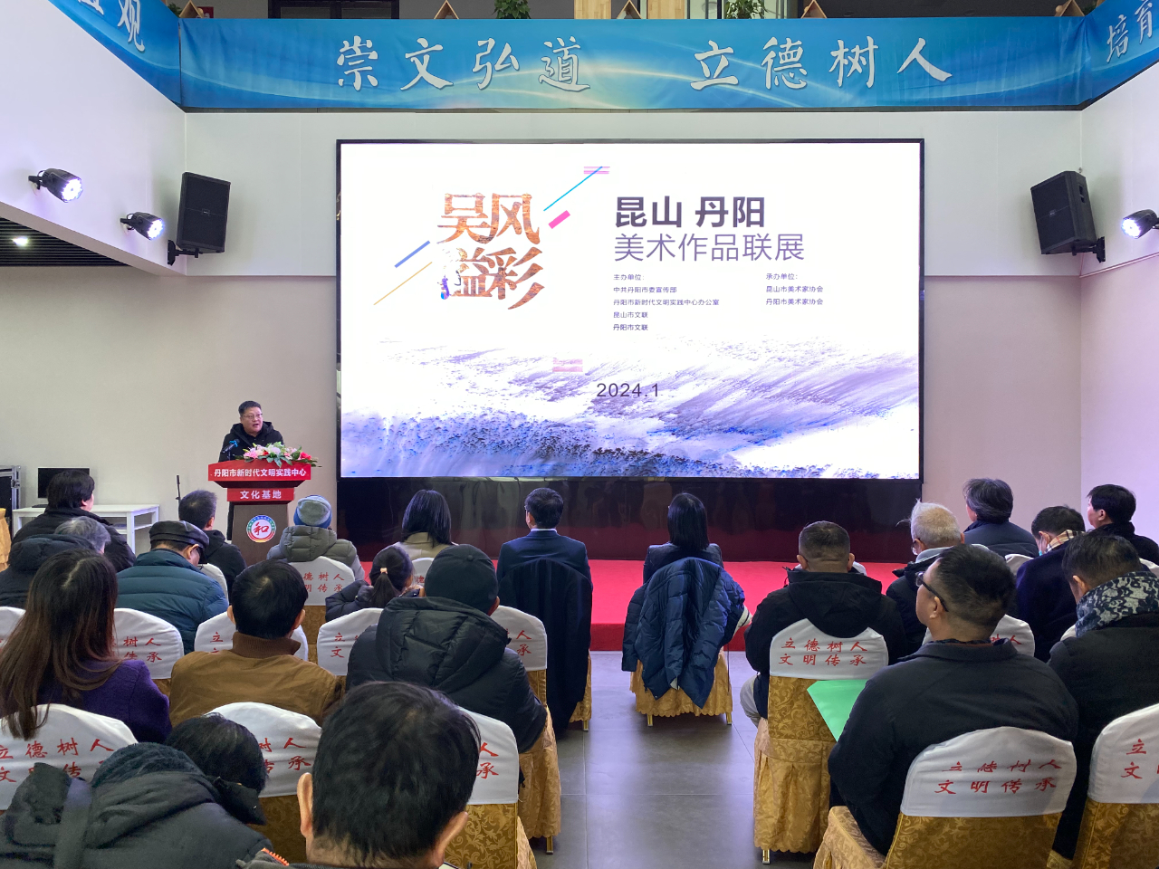 1月22日下午,由中共丹阳市委宣传部、丹阳市新时代文明实践中心办公室、丹阳市文联和昆山市文联主办的以“吴风溢彩”为主题的“昆山•丹阳美术作品联展”在丹阳市新时代文明实践中心文化基地开幕。中共丹阳市委常委、宣传部部长高飞,丹阳市文联主席丁方晓,昆山市文联党组书记、文联主席冯惠清等领导出席开幕式。