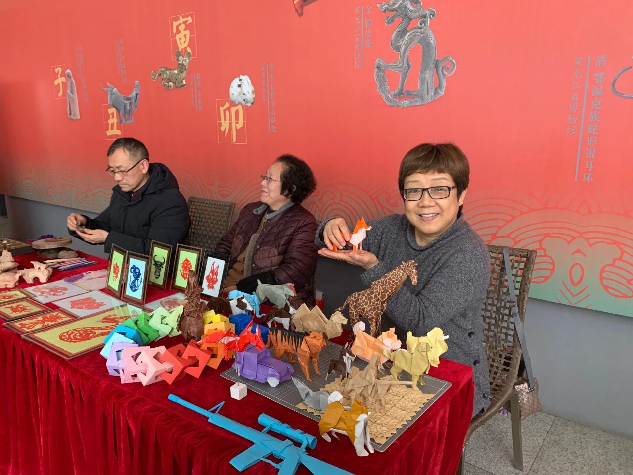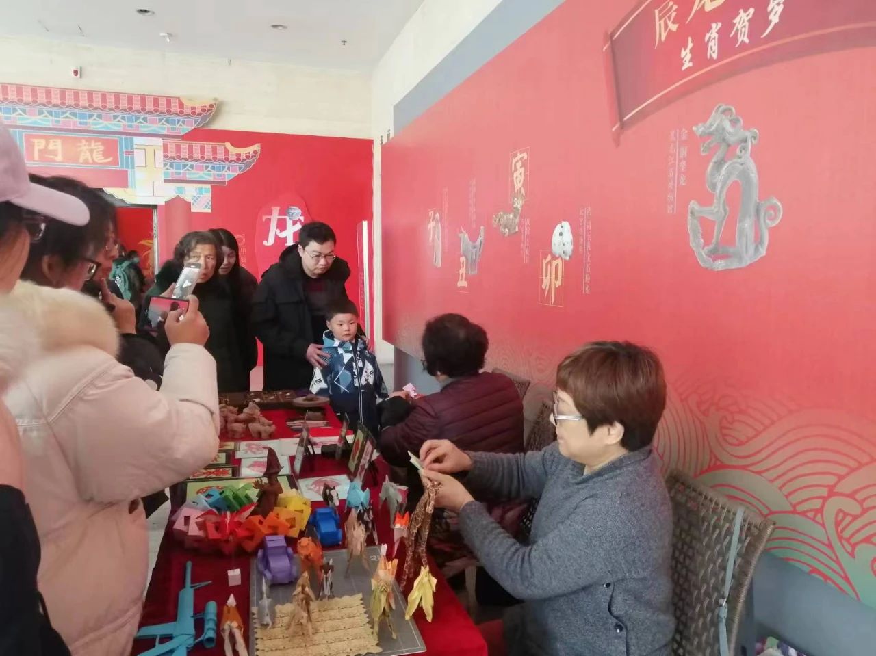 春节期间,展览现场还有剪纸、泥塑、折纸、中国结编织、甲胄制作的民间艺术家展示手工技艺,与观众互动。折纸老师施欣和甲胄制作田浩明是第一次参加这样的展示活动,一张纸,在施欣的手指翻动之间,快速显现出鱼的雏形,再经过翻折塑形,一只旗鱼便活灵活现的制作完成了,现场的小朋友们都拍手叫好。施老师说没有想到折纸会如此受欢迎,能在新春给大家带来快乐,并让更多的人能了解折纸这项传统手工技艺,是非常有益的一件事情!活动现场,民间艺术家还为大家送上了剪纸“生肖龙”和寓意着平安吉祥的中国结。