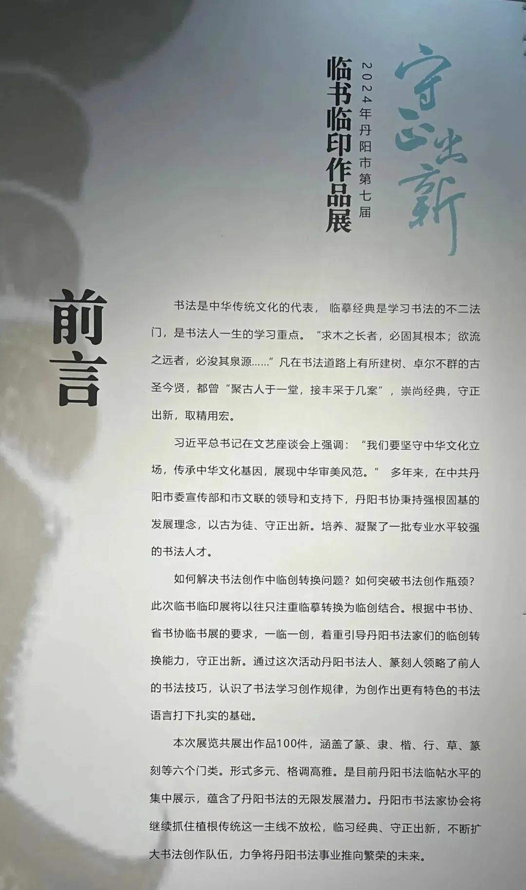 为弘扬传统书法(篆刻)艺术,学习书法(篆刻)经典作品,借鉴古代书法(篆刻)遗迹,营造“深入传统、扎根经典、临古创新”的良好氛围,提升丹阳市书法家以及爱好者的临创能力,进一步繁荣丹阳市书法(篆刻)事业,举办“守正出新”2024丹阳市第七届临书临印作品展。此次展览由中共丹阳市委宣传部、丹阳市文学艺术界联合会主办,丹阳市书法家协会、丹阳市篆刻艺术推广协会、丹阳市文艺家企业家联谊会承办,开幕式在丹阳市新时代文明实践中心文化基地举行。