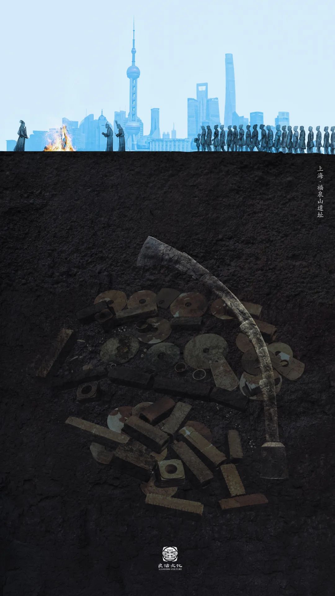 在长三角一体化高质量发展的进程中,现代城市群正以前所未有的速度崛起。而在这片土地之下,静静埋藏着五千年前的文明源头——良渚。本系列以良渚文化为核心,选取上海福泉山、杭州良渚、苏州草鞋山、常州寺墩、无锡丘承墩、泰州蒋庄、嘉兴荷叶地、安徽凌家滩等重要遗址为地理基础,将地上的城市天际线、中层的人物剪影与地下的文化遗存并置于一幅画面之中,构建出一种跨越时空的文明对照。