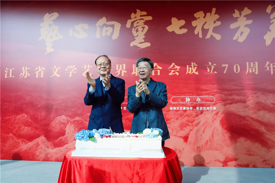 顾浩、王湛为省文联成立70周年分切生日蛋糕