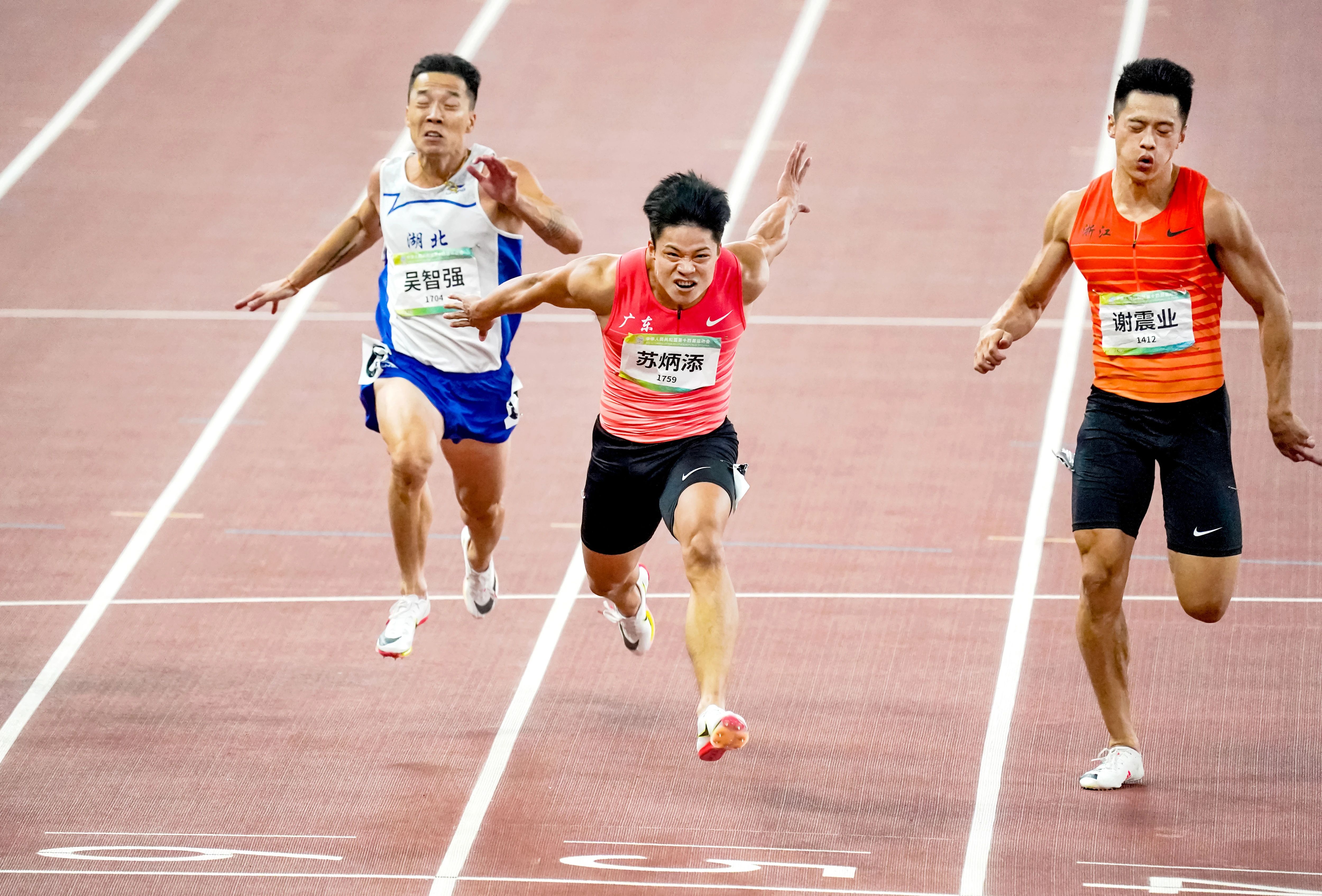 2021年9月21日晚,第十四届全运会男子100米决赛在陕西西安奥体中心体育场举行,苏炳添(中)最终以9秒95的成绩夺冠。