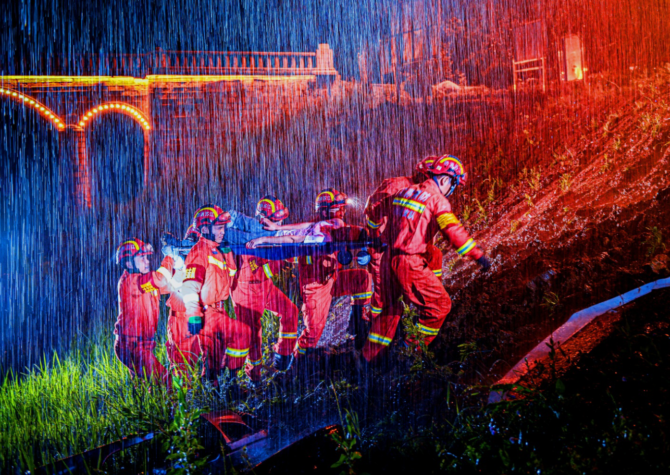 评委会评语:在突发的车祸现场,大雨中7名消防员争分夺秒抢救伤者。夜晚光线较暗,但作者利用现场光准确抓取到救人的瞬间,画面中消防队员面部表情和大雨形成的雨丝清晰可见。而现场灯光和消防员的橙黄色支付也形成了统一的暖色调,渲染了照片的气氛。