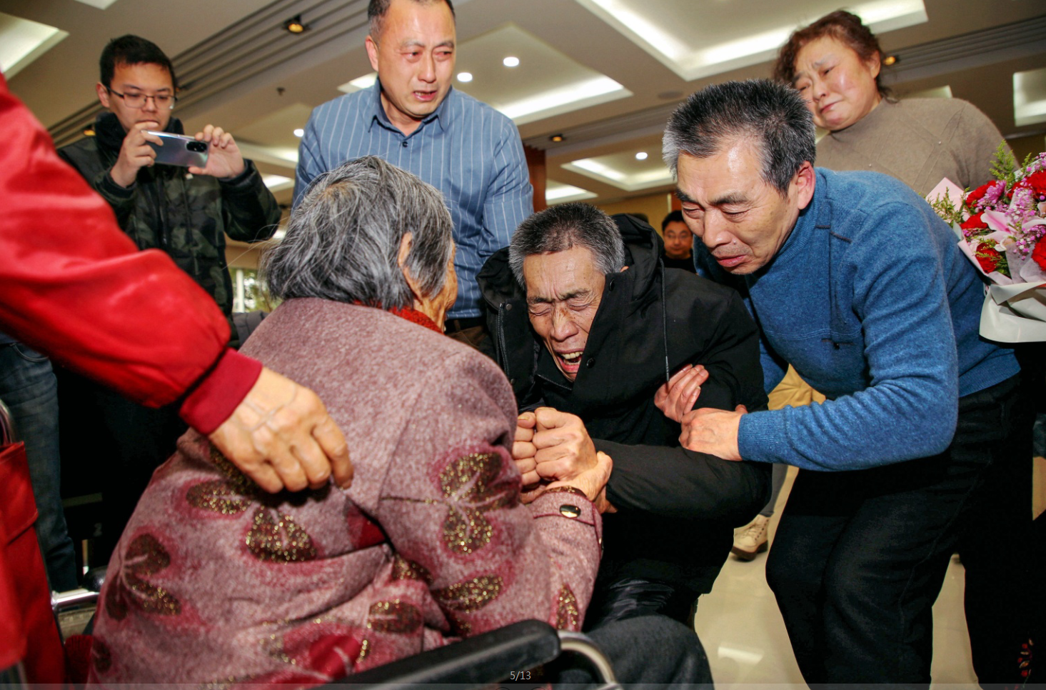 2022年2月14日,在江苏镇江市公安局京口分局认亲仪式现场,坐在轮椅上的94岁范妈妈把长跪不起、失散63年的儿子陈林艰难扶起,母子牵手久久没有松开。