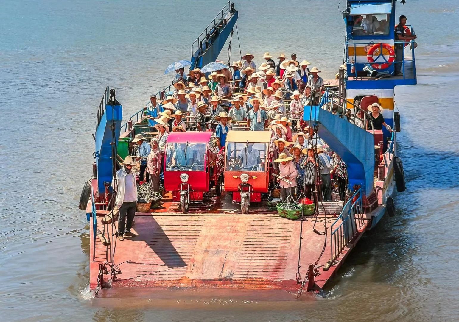 2022年8月7日,安徽铜陵大通镇,菜农乘渡船驶过长江去菜市交易。