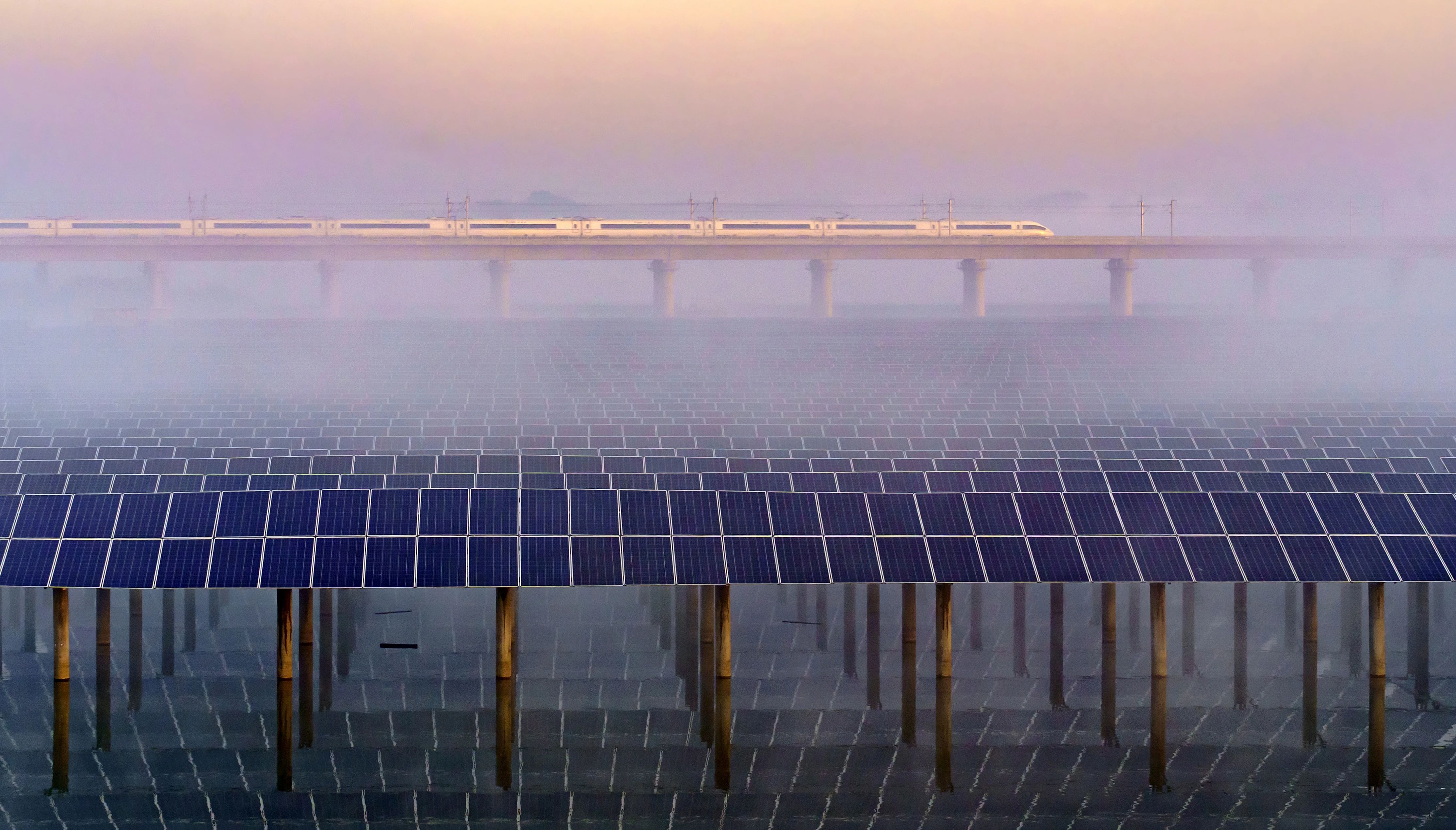 2021年12月6日,浙江安吉,晨雾之中,一列高铁列车从光伏电站上方疾驰而过。