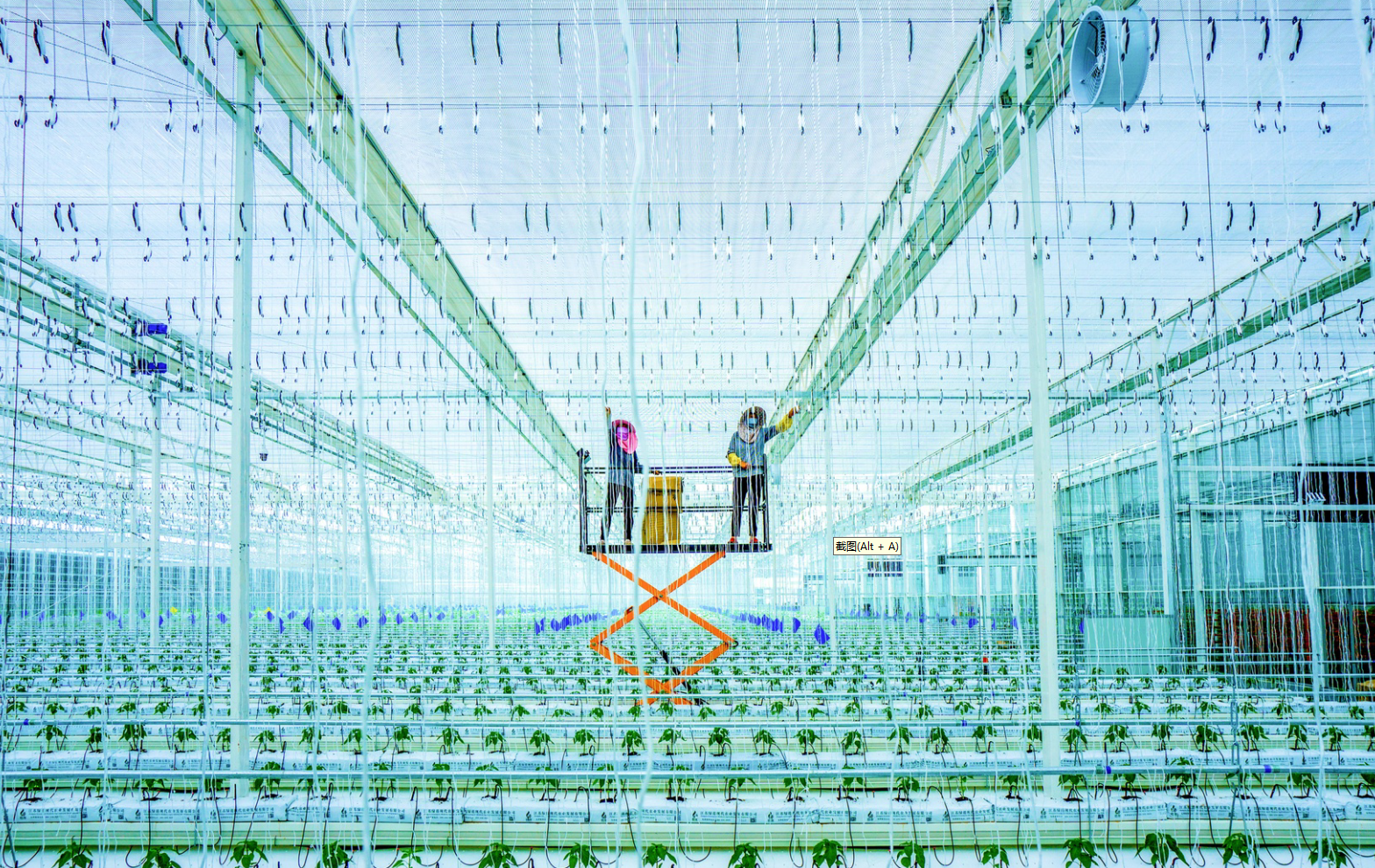 2022年6月28日,江苏宿迁,农业工作者正在为无土栽培植物搭线。