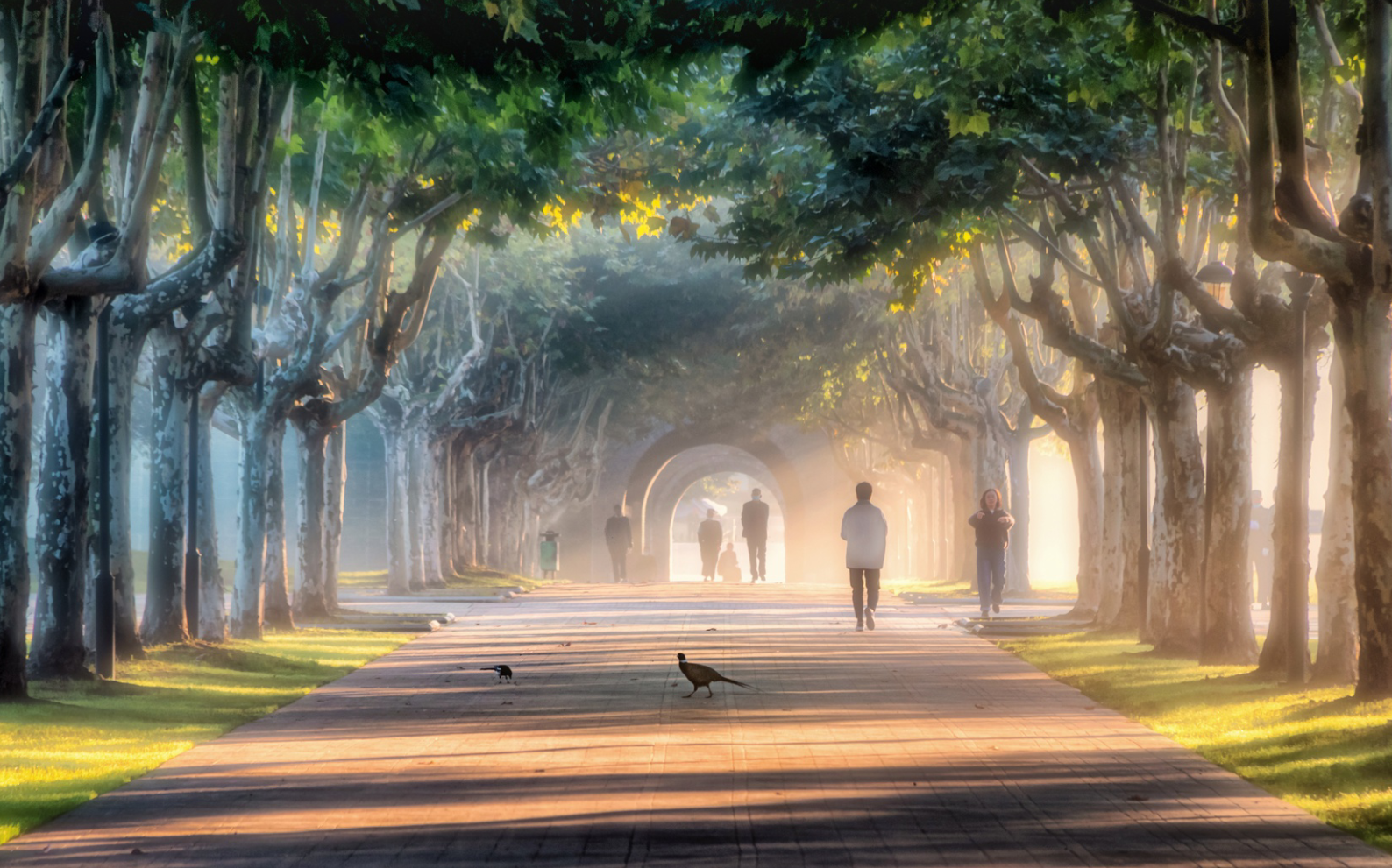 2021年10月21日,江苏扬州,清晨的宋夹城公园林荫道上,雾气弥漫,晨练的人们和鸟儿和谐相处。
