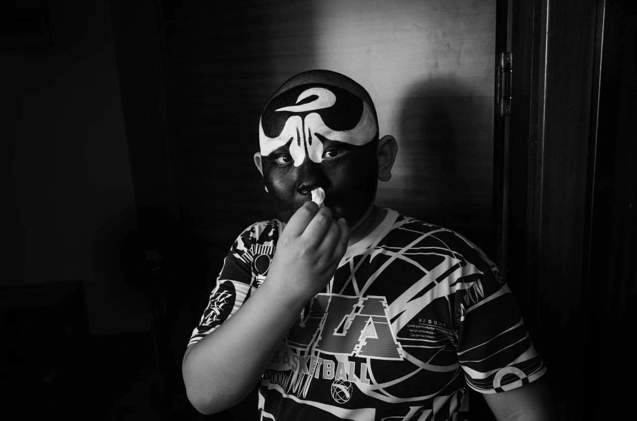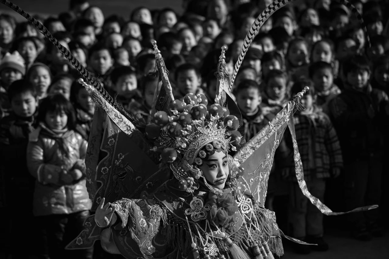 西场小学校园京剧社团的孩子们准备为村民进行京剧演出。