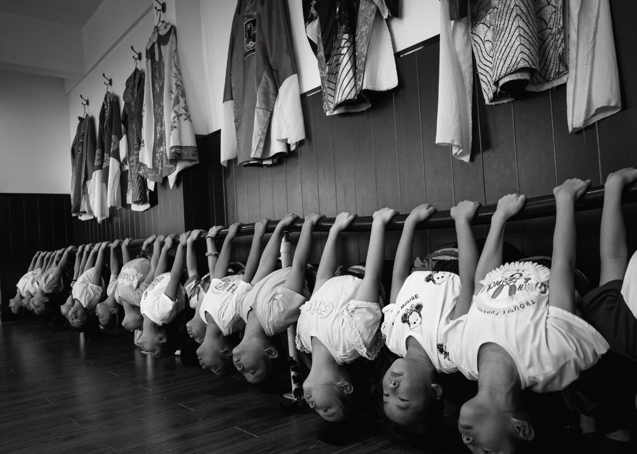 西场小学校园京剧社团的孩子们正在进行腰部基本功训练。