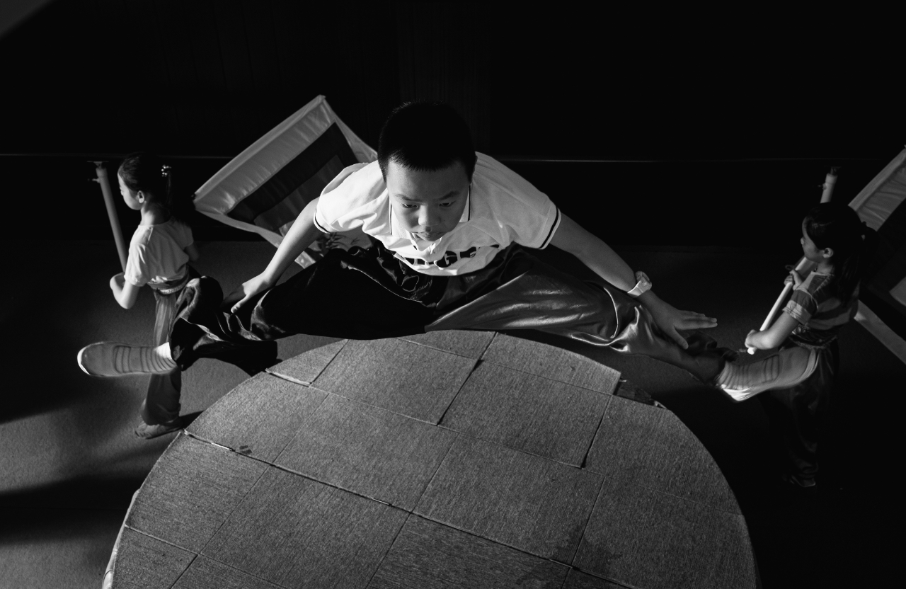 西场小学的校园京剧社团练功室内,小学员在鼓面上进行“大跳”训练。