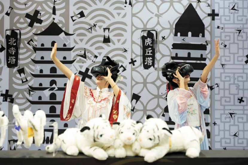 2024年10月18日,苏州市文化创意设计产业交易博览会的现场,两位身着古装的女士借助高科技VR眼镜,沉浸式畅游苏州古城。