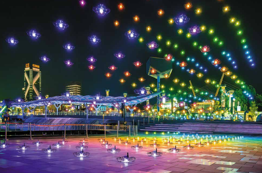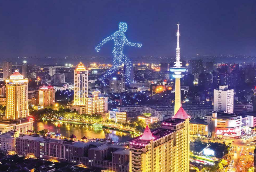 2024年6月9日傍晚,南通环西广场人山人海、灯火辉煌,瞬间八百架无人机升空表演,空中出现各种文字、图案等,整个夜色美如画。