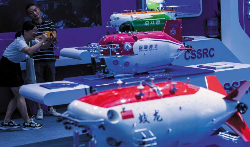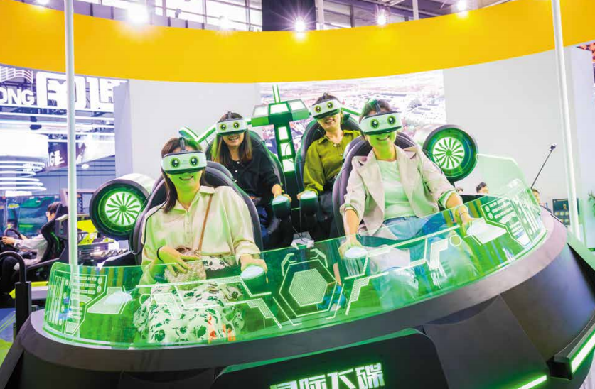 摄于2023年9月,在南京市国际博览中心举办的文化和科技融合展览会上,一群青年人正戴着VR(虚拟现实)眼镜,沉浸在数字化的虚拟世界中,体验一场奇妙的旅行。