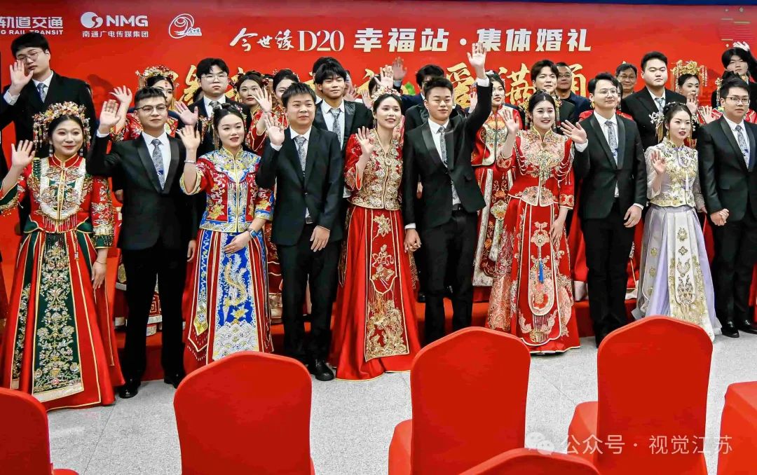1月5日,南通轨道交通25对新人集体婚礼在通往“幸福站”的地铁2号线上隆重举行,温馨又浪漫。顾红波摄