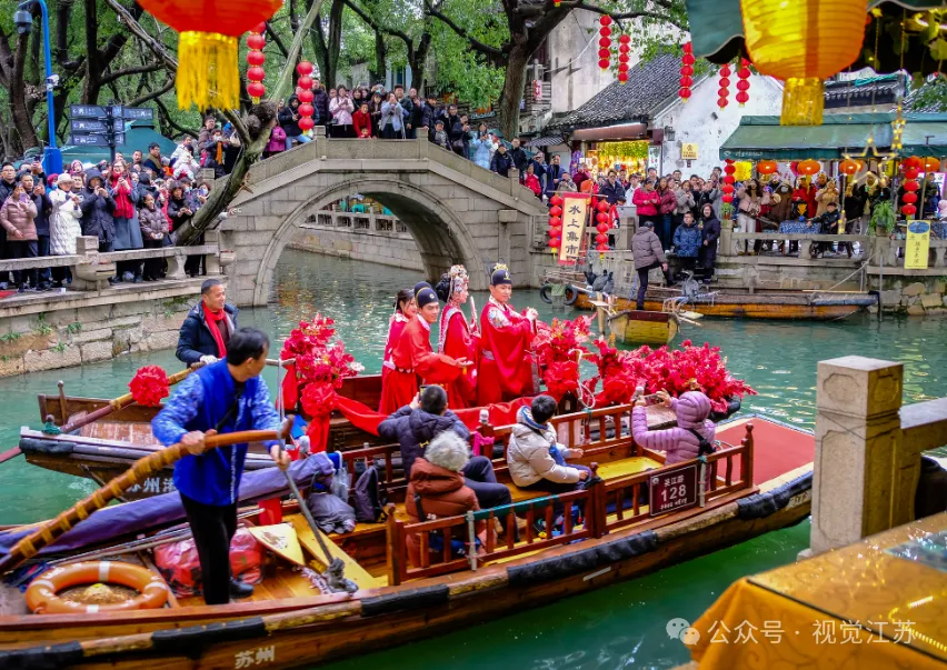 2月1日大年初四,苏州同里古镇,婚礼船向游客船抛散喜糖,开心互动。曹自萍摄
