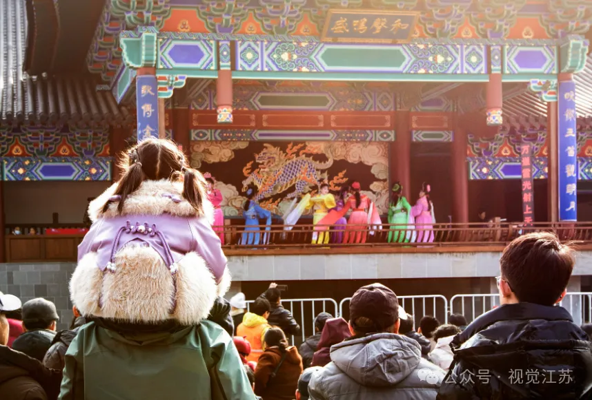 1月29日,淮安市淮安区河下古镇茶巷广场举行民俗展演活动,一位萌娃骑在爷爷的肩上开心地看着表演。朱天羽摄