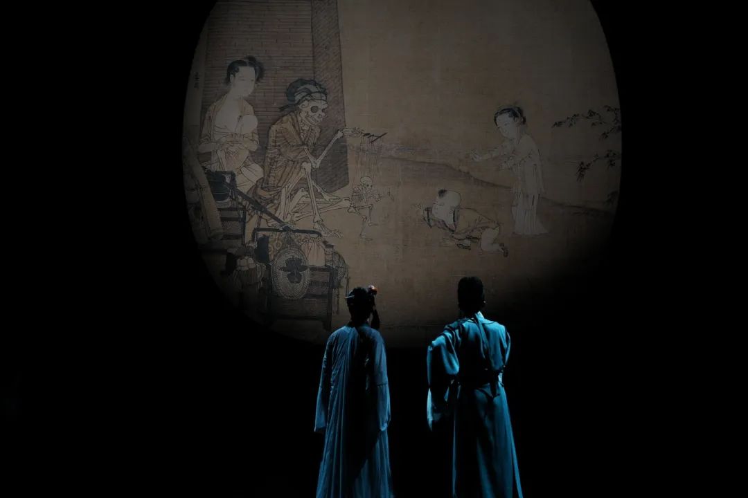 闽江岸畔,当仅有骷髅之身的傀儡艺人陆偃操纵小傀儡翩然起舞,演绎《庄子休梦骷髅》时,周遭看客沉浸其间。李嵩定格的这幅《骷髅幻戏图》由福州闽剧艺术传承发展中心幻化至舞台,叙述嘉定初年,民间艺人陆偃携妻阿舞漂泊市井,因意外身亡后,他“灵魂不死”的执念凝结成画中人对于情的永恒守望,陪伴妻儿十五载。当陆偃在弥留之际用偶戏向儿子演绎着自己的人生悲剧时,有限的生命却在艺术化用中延展出无限温存,让世俗伦常中的至情大爱永驻心间。全剧以民间技艺承载生命哲思,让八百年前的画境与今人的情感产生共鸣,用吟唱传递“至情”真谛。