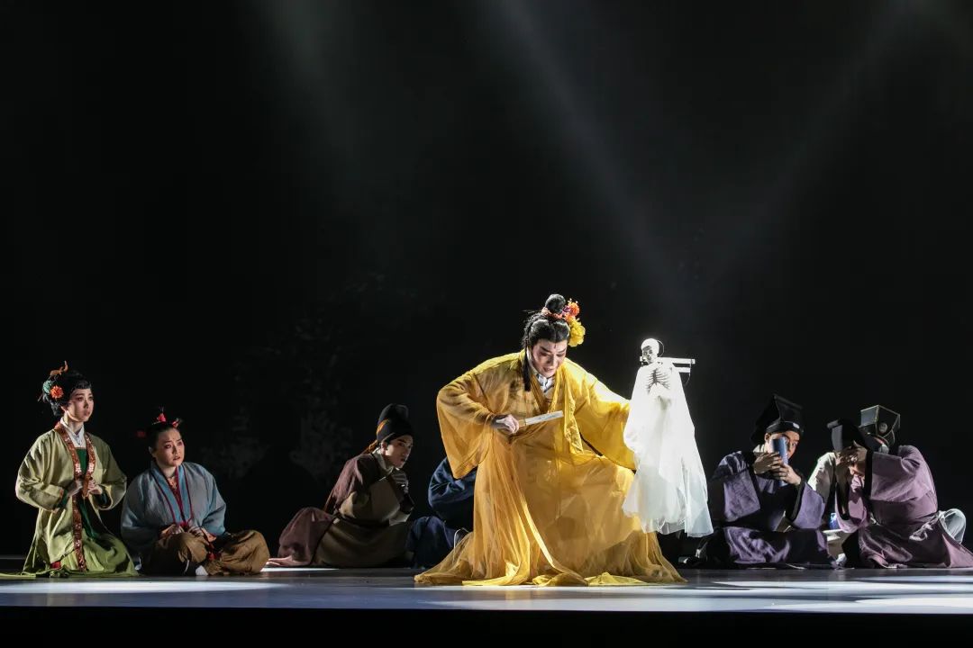 当“没半点皮和肉”的陆偃与李嵩去往货郎家时,人鬼同路的设置在舞台上构建出奇异的双重空间:一人一鬼,一动一静,同台同路不同空间,杨帅运用人物状态的表演和调度的穿插来体现两个人物不同且鲜明的特性。为呈现陆偃“不人不鬼”的“幻戏”表演,杨帅借鉴了许多高甲戏“以丑为美”的程式,以及日本能剧的形体仪态,将之融于中国戏曲的身段之中,以“戏中戏”解构观演关系,使台上的观众既能透过傀儡观看陆偃的人生悲剧,亦能使台下的观众凝视自身在历史洪流中的生存困境。第五场《化尘》中,行将消散的陆偃撑着最后一口气,用手中的骷髅傀儡向儿子陆正剖白半生经历。那骷髅是陆偃、是爱妻,也是见证,时而是陆偃的另一面,时而是他一生的旁观者。当傀儡在丝线牵动下,杨帅演绎出了市井艺人毕生的悲欣:有甜蜜、有欣慰、有懊悔、有不舍、有不甘、有无奈、有苦涩、有释怀、有对妻儿以及这人世间的眷恋。