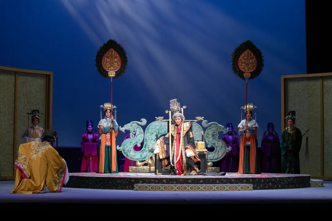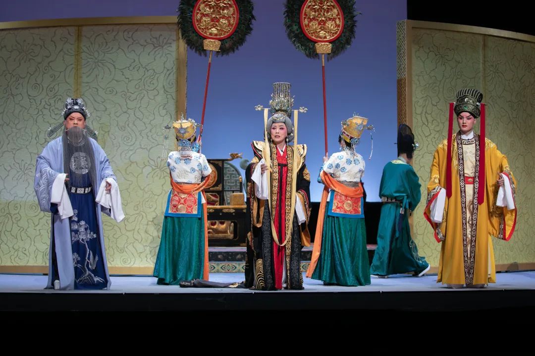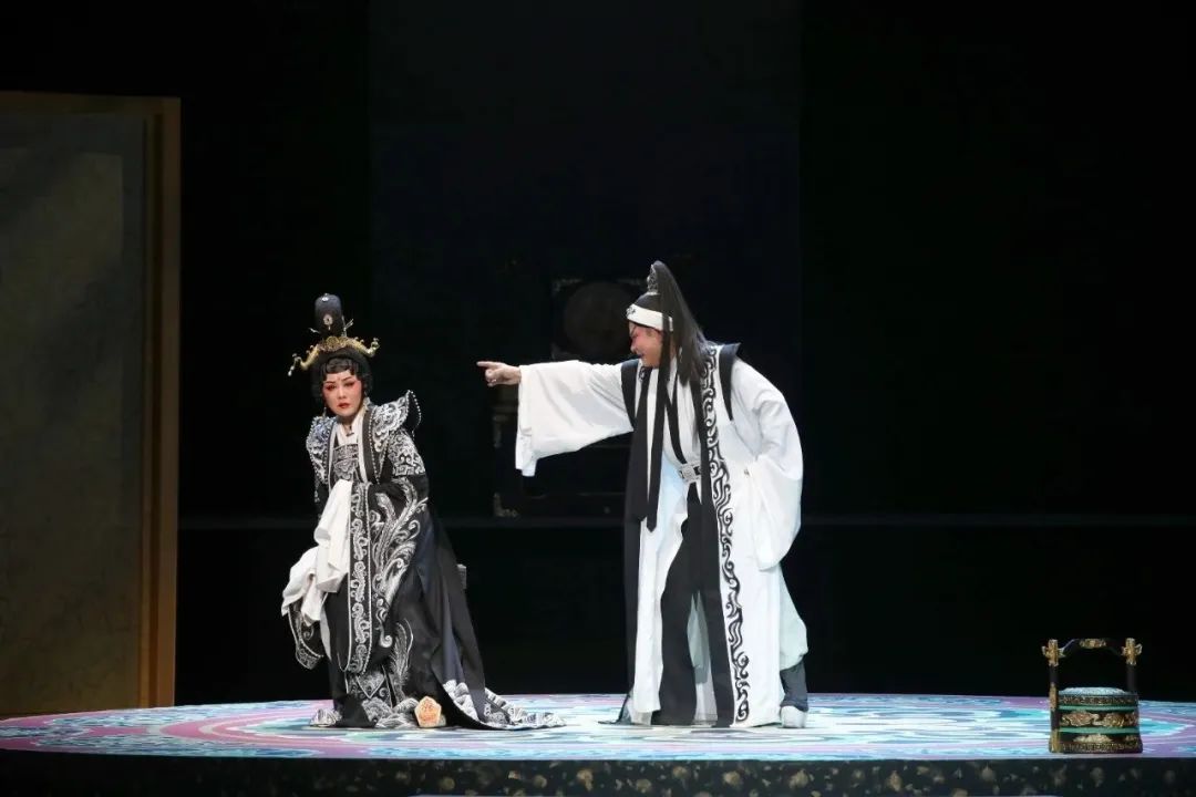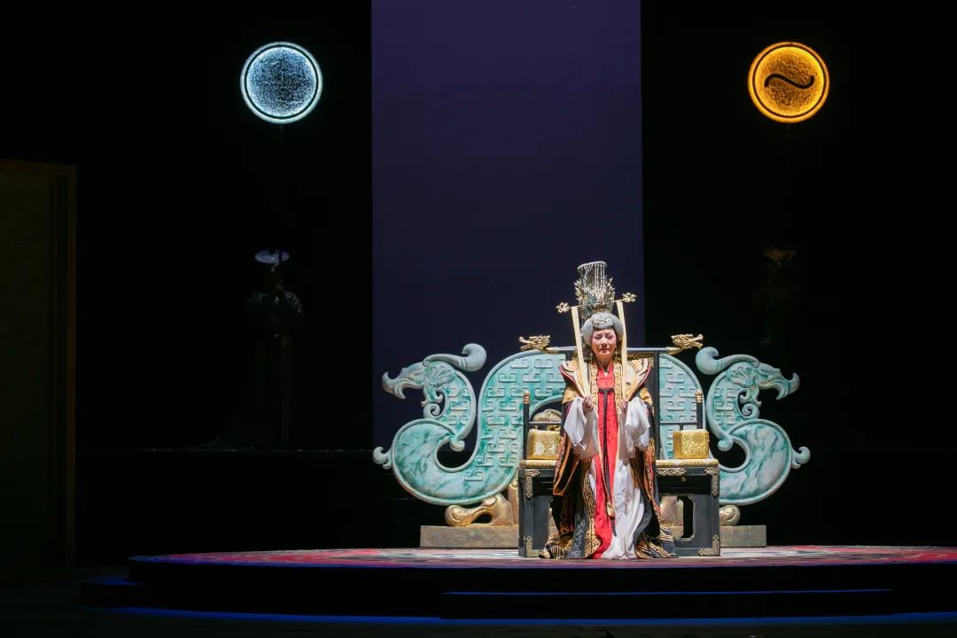 导演张曼君通过独特的舞台调度和视觉呈现,将这种内心的挣扎具象化。舞台上,简洁明快的构图和富有深意的色彩符号,营造出一种既庄重又压抑的氛围。音乐融入现代交响乐要素,悲壮高昂的唱腔,生动展现出大唐气象和铿锵唐音,更彰显了武则天“大道孤勇、一往无前”的胆略与气魄。