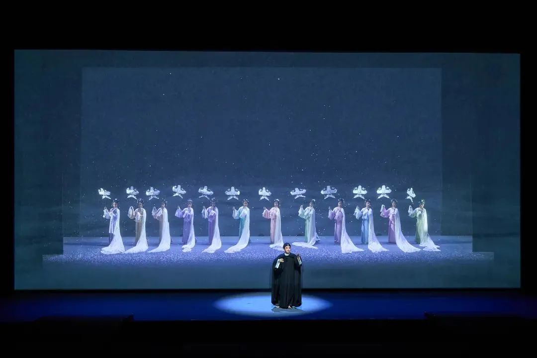 导演翁国生构建的“意境红楼”,实现了戏曲写意美学与当代视觉语法的有机融合。铁艺亭台勾勒出流动的叙事空间,多媒体投影将稻香村的暖、栊翠庵的寒转化为情感色谱。特别是在【冬·泪尽】场次中,素月清辉下的扁舟对话以极简主义舞台构造出“空白美”的深邃意境。当十二金钗的素纱在风雪中幻化为流动的墨痕,传统戏曲的“虚拟性”原则与当代装置艺术形成跨时空对话,印证了格洛托夫斯基“质朴戏剧”理论中“演员与观众”的本质关系。