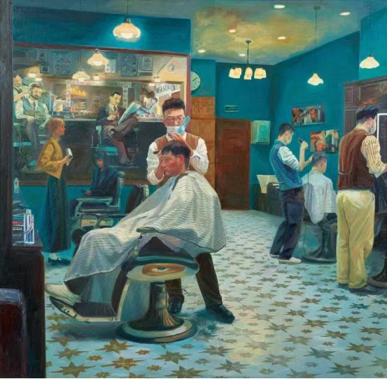 青年艺术家们以敏锐的视角和大胆的探索,突破传统人物画题材形式表达的固有藩篱。用饱含热情的笔触描绘人物外貌、神态与气质,让观者可以自由地与画中人物进行目光对视和心灵对话。作品《都市生活·理发馆》为典型的写实风格,它以细腻笔触和写实的人物造型描绘了传统理发店的温馨一隅。柔和的蓝色调铺陈出沉稳空间,暖色服饰与之形成鲜明的对比。饱满的全景式构图展现了店内的繁忙景象,镜中的倒影拓展了画面的表现空间,仿佛诉说着往昔时光中的温暖日常和岁月沉淀。