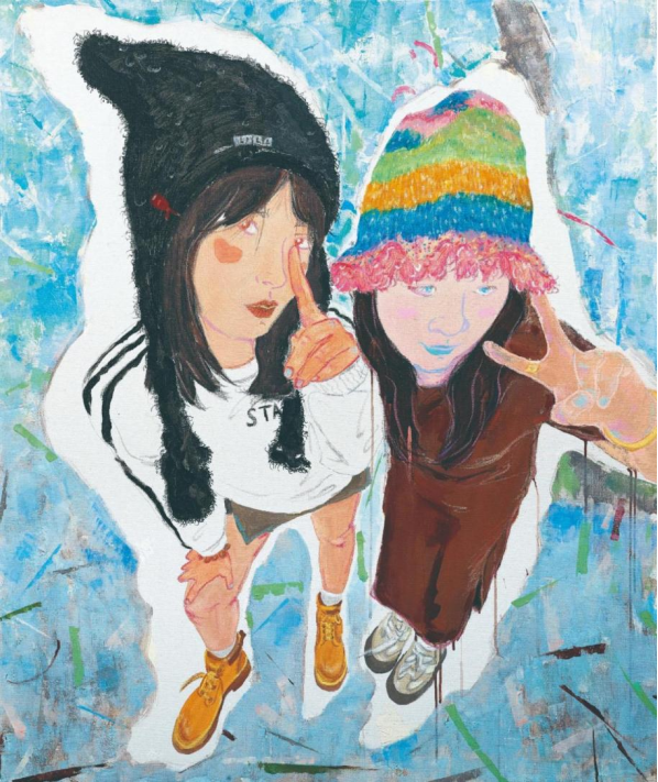 还有部分作品融合了装饰化的风格元素,体现了青年艺术家勇于创新的精神。这类作品以平面化的构图、鲜明的色彩对比、丰富的质感和肌理,营造出极具视觉冲击力的画面。作品《美好周末》人物造型采取了适度地简化与夸张的手法,色彩鲜明且富有装饰性,巧妙运用对比色或互补色组合,形成强烈视觉冲击。还有一些作品采用平面化构图方式,将人物与其他装饰元素巧妙融合,使画面宛如精美装饰图案,展现属于青年一代的朝气,也为中国油画的意象化表现体系注入了新的活力。