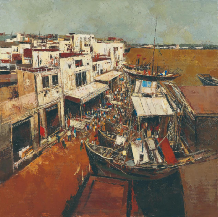 在当代绘画界,风景创作无疑是检验艺术家创意与胆识的试验场。本次展览中的青年艺术家也不遑多让,呈现出打破常规表现形式,勇于探索的势头,以多元化的自然关照展现青春风采。写实类作品以真实地再现自然为主旨,凭借精湛的技艺描绘出不同自然元素的形态与质感,让观者仿佛置身于真实的风光中。作品《渔歌唱晚》记录了港口集市的繁忙景象,似乎能听到集市的喧嚣和海浪的轻拍声。画面色彩以暖色调为主,橙黄的地面与棕褐的木船互相交错,衬托出天空的灰蓝。笔触厚重而富有表现力,近处的船只与建筑以粗犷的线条勾勒,展现了质朴风貌。