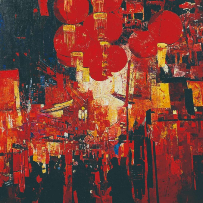 还有部分风景作品融入装饰化的元素,体现了青年艺术家对于形式美感的追求。他们将物像简化为几何形状或图案化元素,借助重复、对称、均衡等装饰手法进行有机组合,强烈、鲜明的色彩让画面充满新意和动感,凸显活力与个性。作品《灯耀祥进》构图独具一格,色彩单纯、浓烈,呈现出浑厚、粗粝的装饰意味。红色占据画面形成视觉主导,黑色背景如无垠宇宙为红色元素提供衬托。大小不一的红色圆形散落画面,宛如远古图腾在黑暗中闪烁神秘的光芒,下方的黑色剪影增添了作品的神秘感与深度。激发了观者对于历史、节日、时空与社会关系的诗意联想。