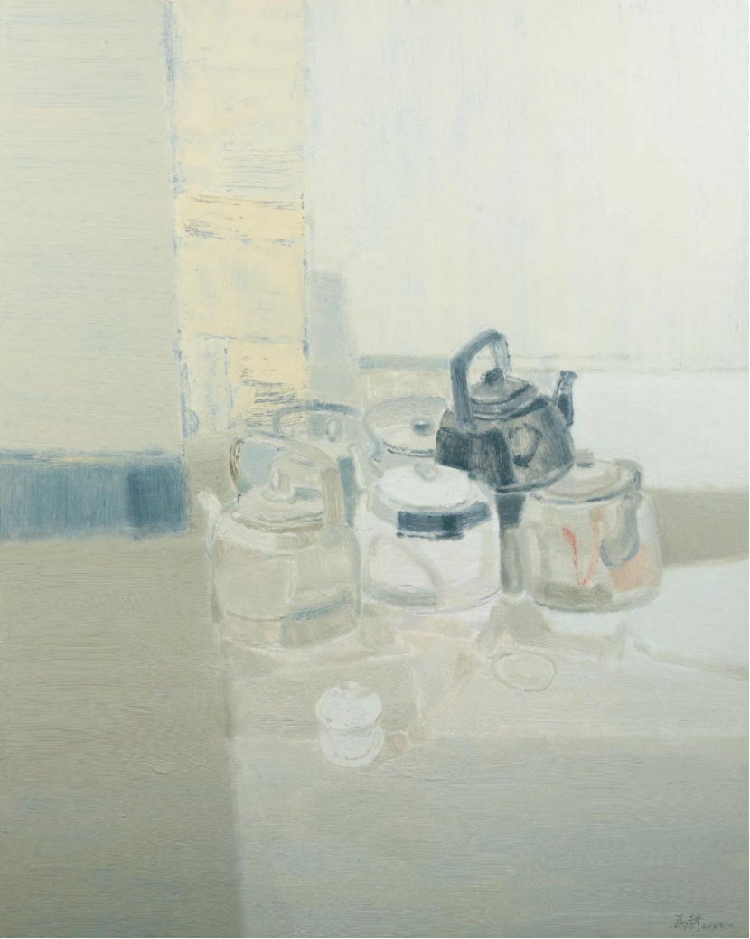 静物油画在此次展览中也展现出独特的魅力。写实风格作品以精湛的技巧将静物的形状、色彩、质感等特征一一呈现出来。瓷器表面的光滑、水果上细微的纹理,抑或是金属器皿的冷硬光泽、布料柔软的褶皱都刻画得若可捉摸。遗憾的是,这类作品不多。融合了写意和装饰意味的作品占据主导,这类作品则更注重色块的组合、搭配与激情表现,传达青年人的情感与思想。他们以自由奔放的笔触和富有变化的色彩,对静物进行大胆地概括与提炼。物品不再是单纯的物质存在,而是成为画家情感表达的载体。色彩运用上也打破常规而根据画面需要进行组合,通过色彩的明度、纯度、冷暖变化营造出独特的画面氛围与情感张力。作品《物象之一》以淡雅的色彩与细腻的笔触,描绘出一组静置于台面上的茶壶、玻璃罐与小物件。背景是简单的灰白色墙面与台面,几道竖向的淡蓝色笔触为画面增添一丝灵动,营造温馨的时光和静好的氛围。
