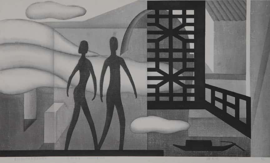 存周主要从事的是水印木刻版画。水印与油印的不同之处在于:油印以油墨为媒材,印出的效果厚重刚硬,有如金石的铿锵;水印以水性颜料为媒材,并借助水的晕染,有浓淡氤氲之致,其效果也最与中国传统水墨画相近。然而,水印木刻究竟是“木刻”,它是一种以“刀味”“木味”为骨,“水味”“墨味”为韵的现代版画样式。与传统复制版画(如《十竹斋笺谱》)相比,现代水印木刻更强调艺术家的个性创造,他们将“刀味”的刚硬、“木味”的温润和“水味”的氤氲当作纯然抽象的语言要素,服务于主观意象的营构,又在印制过程中借助宣纸的反馈,重构出异于现实世界的版画图像来。