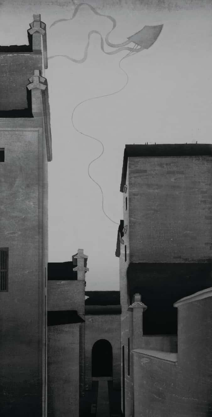 尽管存周对形式极为看重,但他并未坠入纯形式主义的极端,而是借助半抽象的形式语言,营造出某种深邃悠远的意境。那意境往往指向辽远、空寂乃至地老天荒的永恒。值得注意的是,他作品中反复出现的一个符号——纸鸢(风筝)(如《老屋幽梦一线牵》《纸鸢十里借春风》《二月风筝线儿断》《古镇随笔》等),那个飘忽无定的身影所暗示的短暂与无常,恰与同框中的沧桑古建形成强烈反差,愈加凸显出作者对生命易逝的喟叹以及对永恒时空的追寻。而在这喟叹与追寻之间,便有某种诗意的哲思在画面中氤氲……