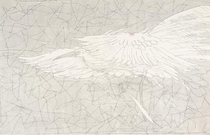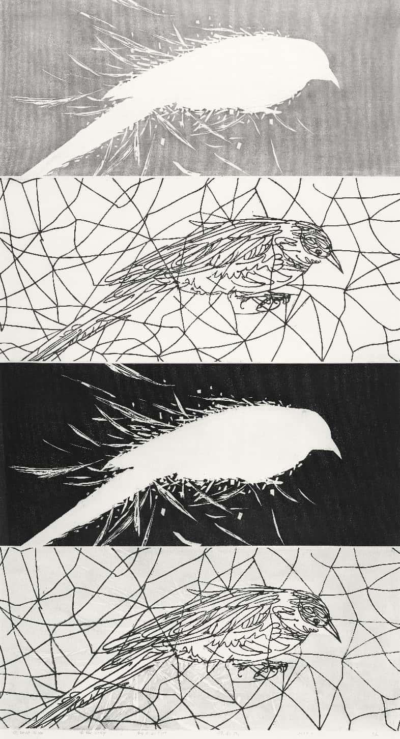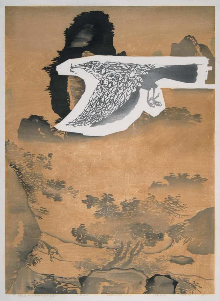濮存周:《飞过张璐画前的飞鸟》,木版水印,2004
