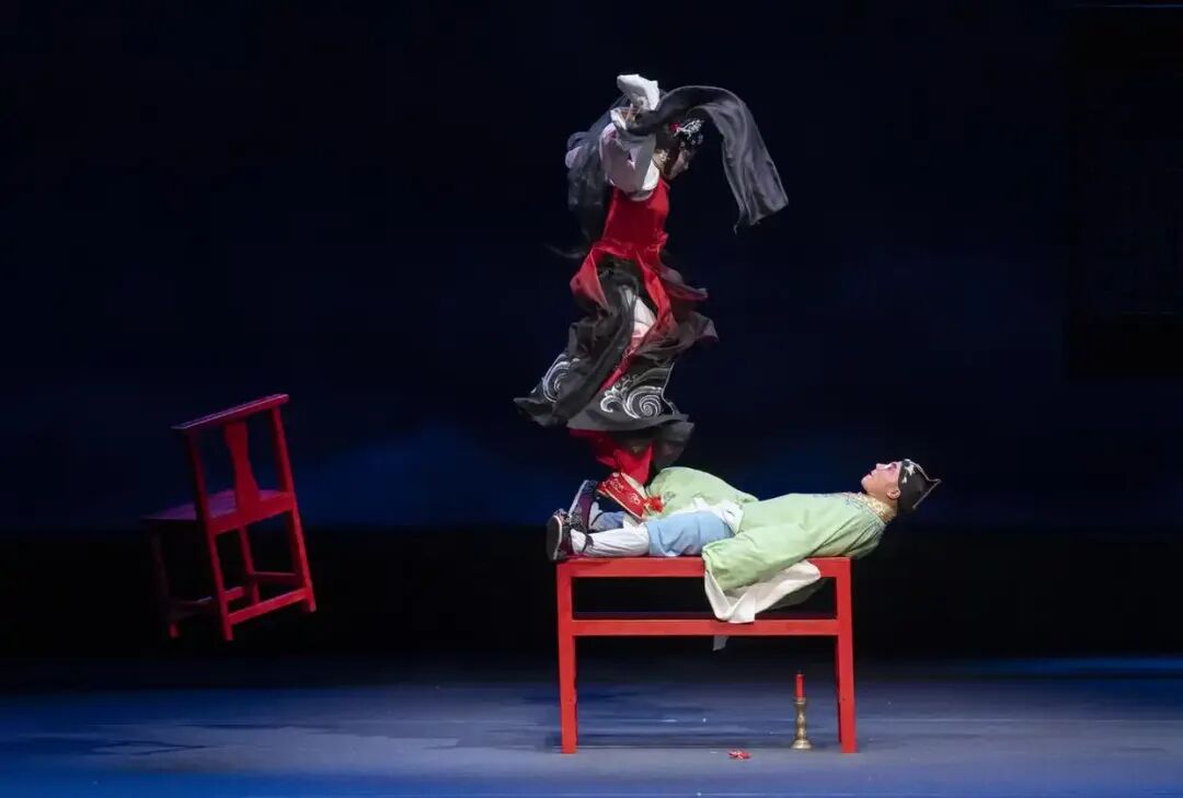 在剧目创作上,三折戏风格迥异又编排协调。经典“鬼戏”题材《活捉三郎》率先登场,随着阎惜娇从“隐身试探”到“现身恫吓”,再到完成“活捉”,诸多高难度技巧轮番上演,强大的戏剧冲突感把观众的感官充分调动。