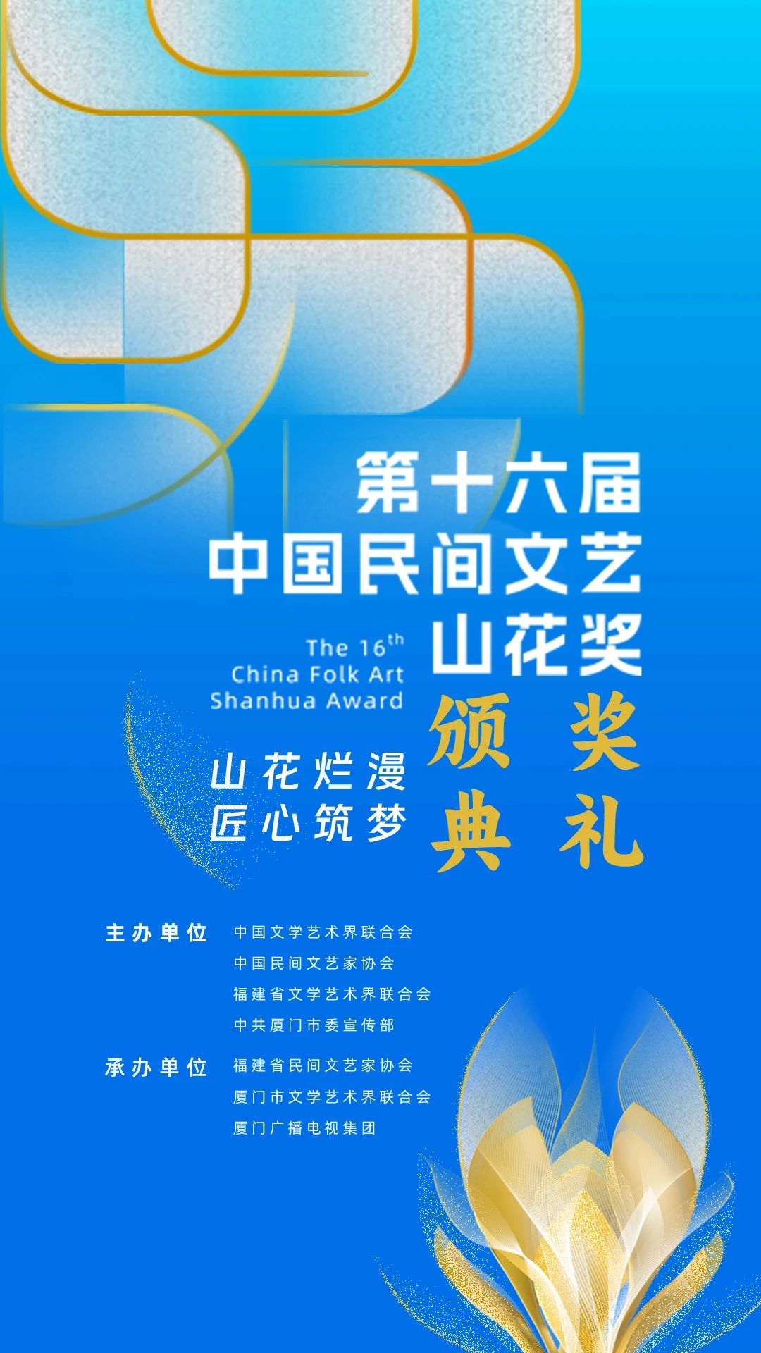 1月18日20:00山花烂漫 匠心筑梦——第十六届中国民间文艺山花奖颁奖典礼将在福建厦门举行