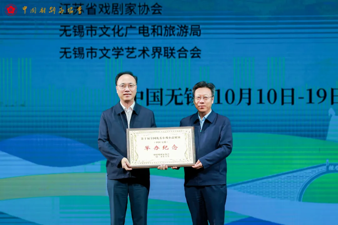 ▲中国戏剧家协会分党组书记、驻会副主席陈涌泉代表中国戏剧家协会向无锡市政协副主席韩晓枫为无锡市颁发举办地纪念牌